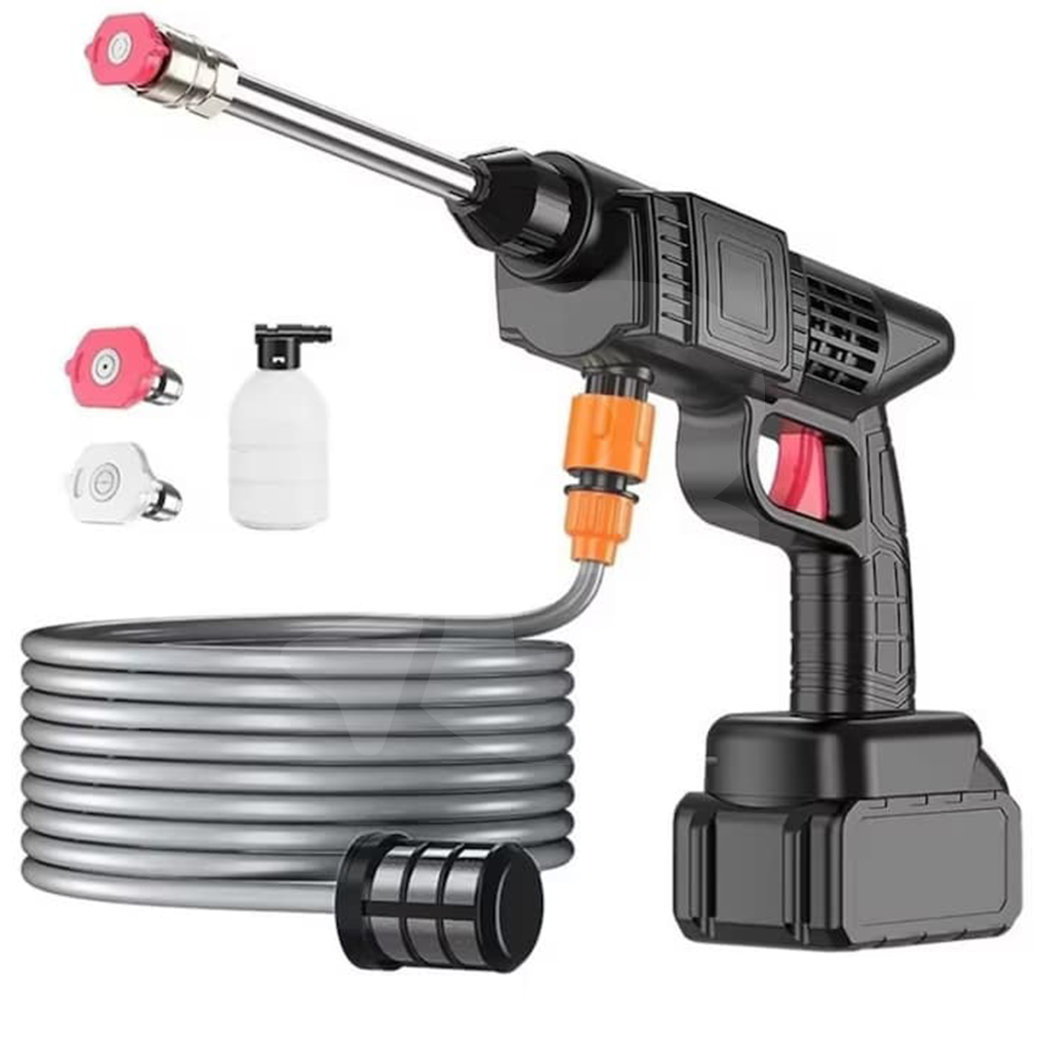 Aparatul de spălat cu presiune portabil tip pistol este soluția practică și eficientă pentru curățare rapidă și mobilă, fără a depinde de priză sau instalații fixe. Conceput pentru utilizare versatilă, acest echipament este ideal pentru întreținerea autoturismelor, motocicletelor, bicicletelor, curților, teraselor, scărilor, gardurilor, uneltelor sau pentru activități gospodărești și agricole. Datorită funcționării pe bază de acumulator, aparatul poate fi utilizat oriunde, inclusiv în zone fără acces la electricitate.