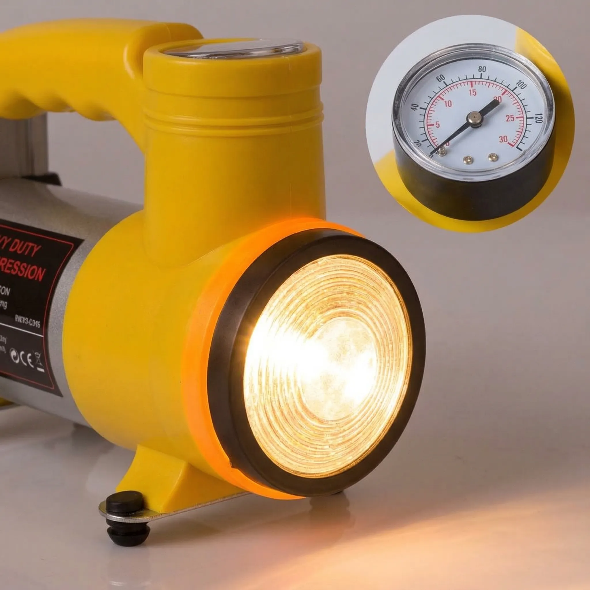 - Funcții Practice de Urgență: Dotat cu un luminator integrat, compresorul poate fi utilizat cu ușurință pe timp de noapte sau în condiții de vizibilitate scăzută, oferindu-ți vizibilitatea necesară pentru a lucra în siguranță.
