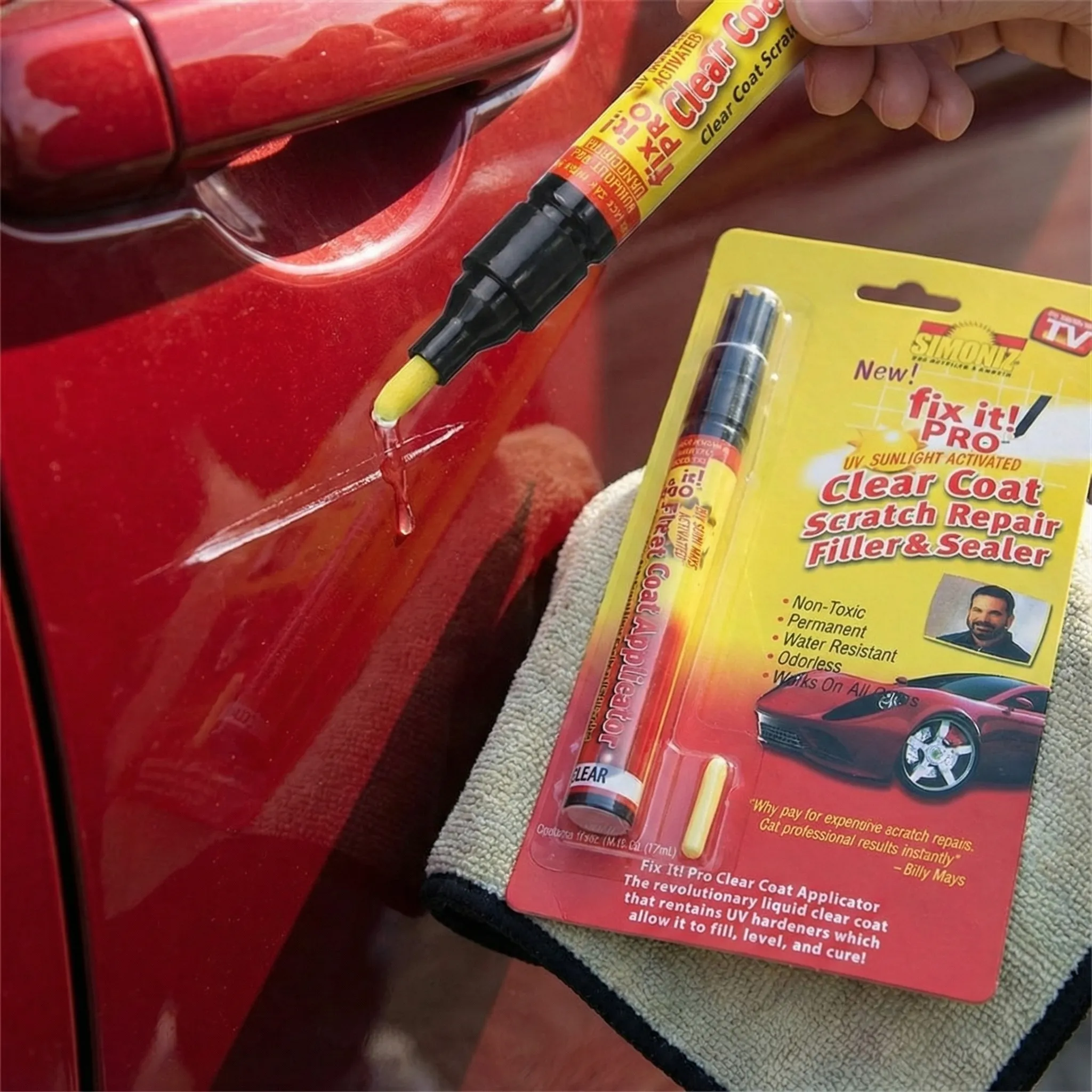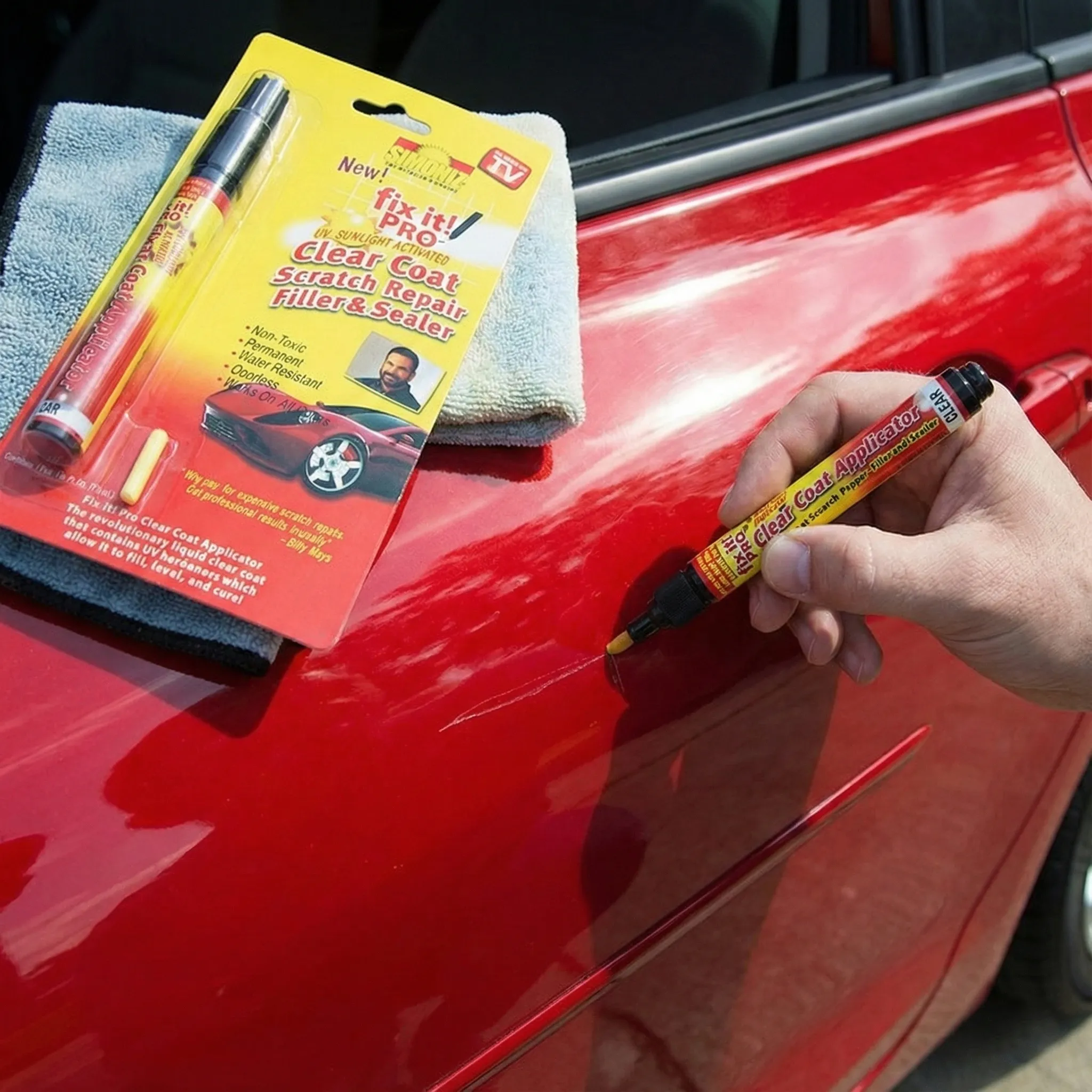 Setul de 2 Creioane Corectoare Fix It Pro a fost creat pentru a oferi rezultate profesionale oricărui șofer, fără a fi nevoie de experiență tehnică. Formula sa specială, activată de razele UV, pătrunde adânc în zgârietură, se lipește de vopseaua originală și creează un strat protector permanent și invizibil.