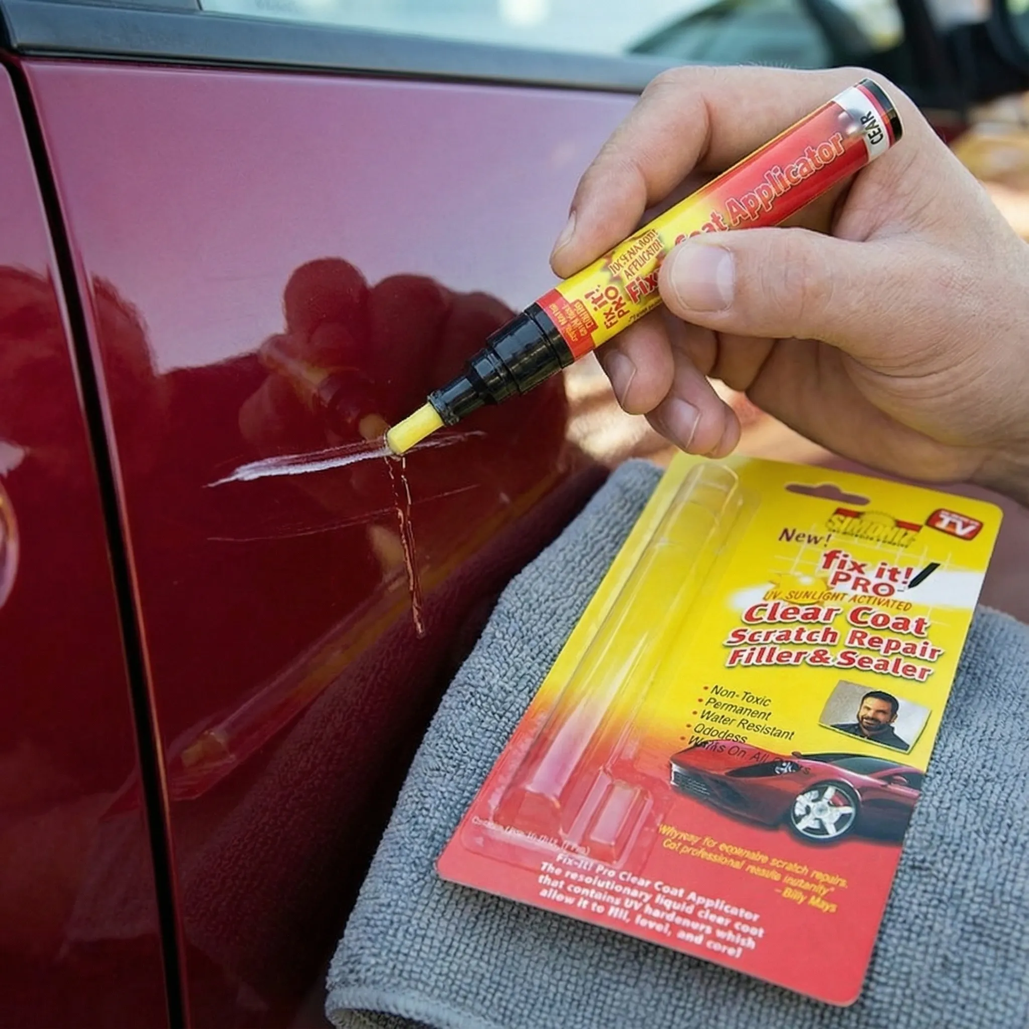 Aplicarea este extrem de curată: agiți, apeși vârful pe o suprafață de test până se umezește și apoi treci peste zgârietură. Ștergi surplusul și lași mașina la soare. Este atât de simplu!