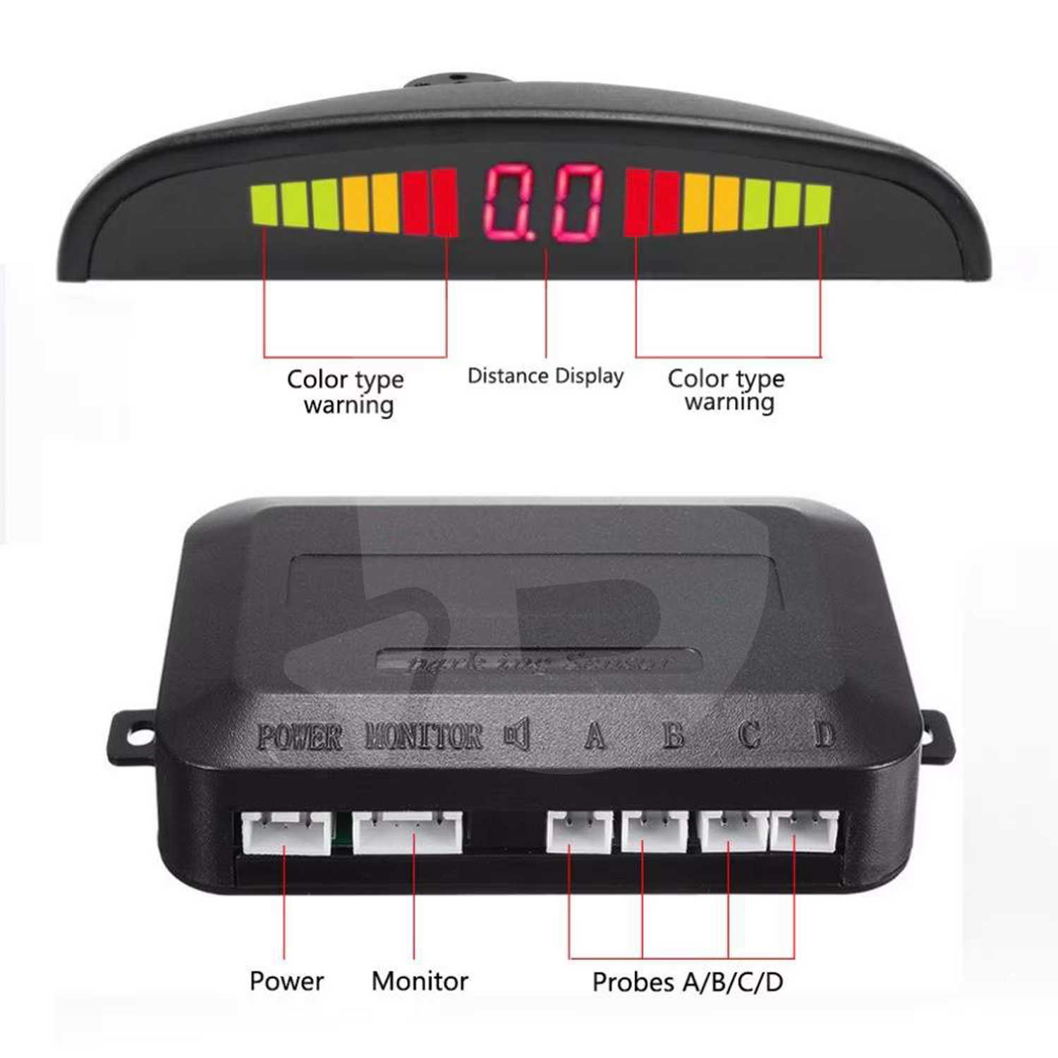 Sistemul este format din 4 senzori ultrasonici de înaltă precizie, montați în bara spate, care detectează obiectele aflate în raza de 0–2,5 metri. Informațiile sunt transmise în timp real către display-ul LED color, ușor de citit, care indică distanța față de obstacol și nivelul de pericol prin culori progresive: verde, galben și roșu.