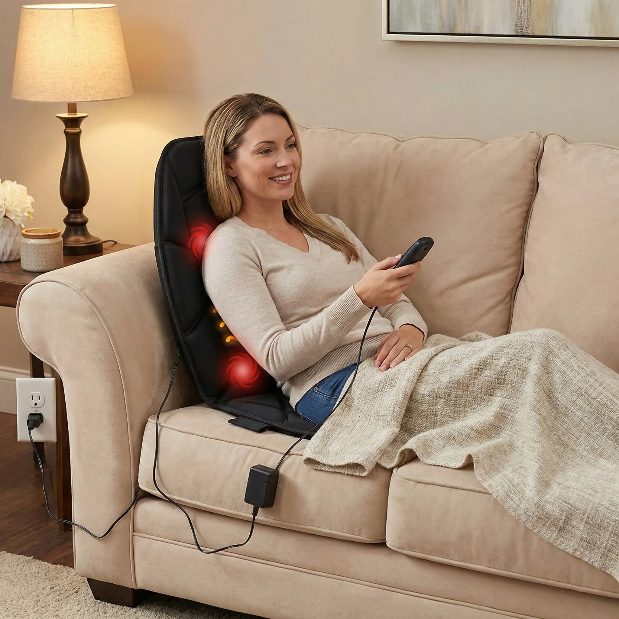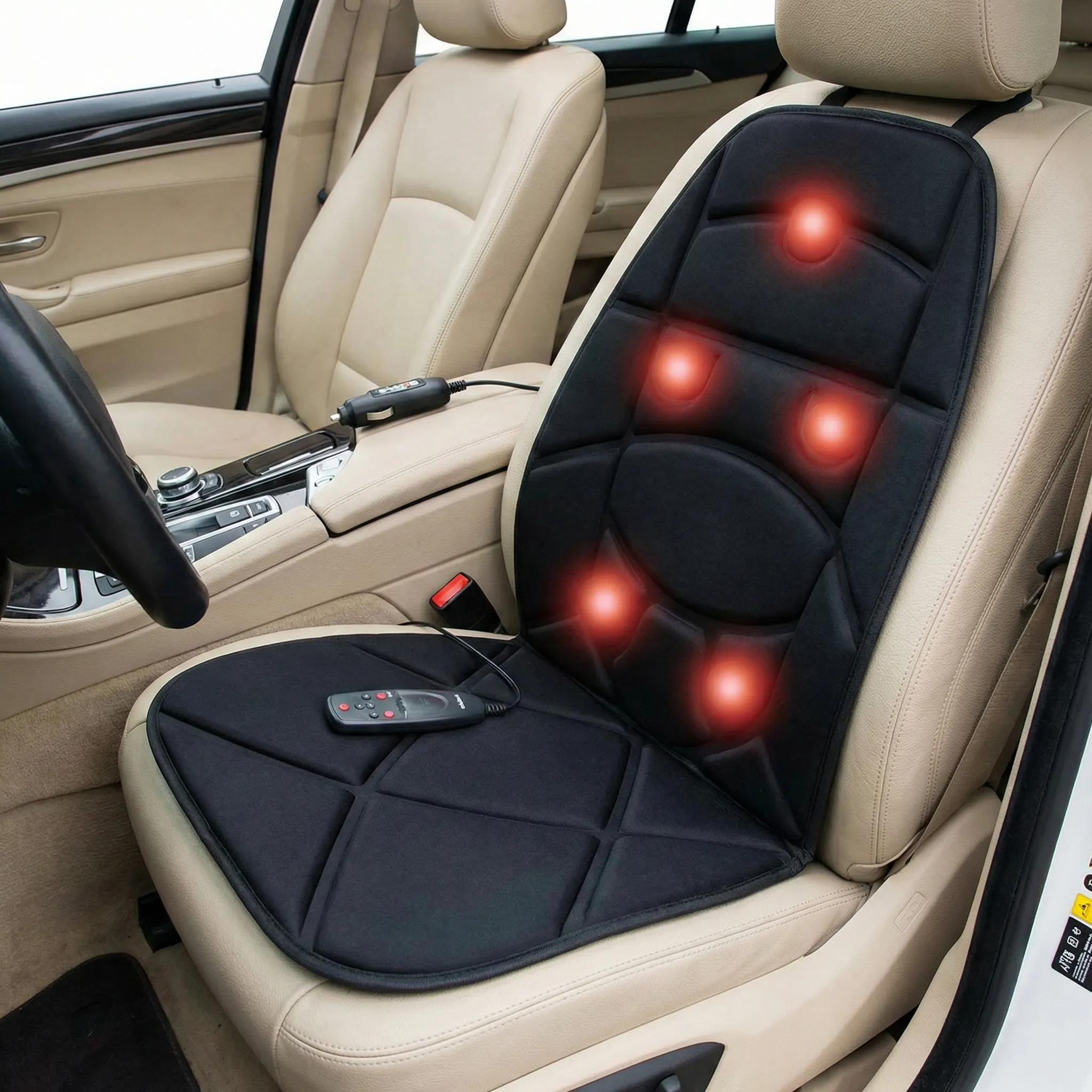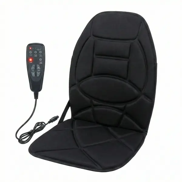 Versatilitate și Fixare Sigură: Datorită curelelor elastice, husa se fixează ferm pe orice tip de scaun (auto, de birou sau fotoliu). Alimentarea sa dublă (adaptor auto 12V și priză 220V incluse) îți garantează că o poți folosi absolut oriunde ai nevoie.