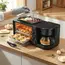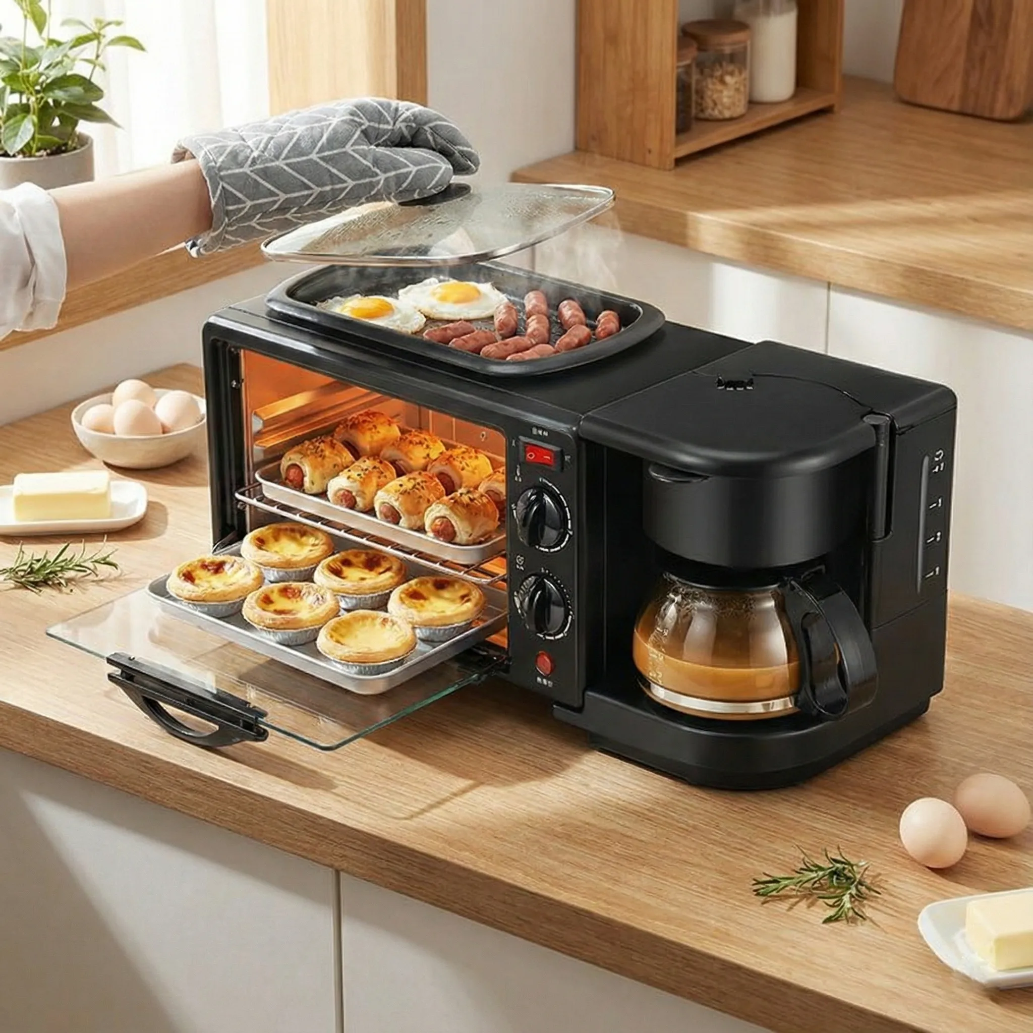 În timp ce cafetiera de 800 ml îți pregătește licoarea energizantă a dimineții, cuptorul de 12 litri rumenește perfect chiflele sau coace gustări rapide, iar plita superioară tip grill se ocupă de partea savuroasă: ouă ochiuri, bacon crocant sau cârnăciori. Totul se întâmplă simultan, controlat ușor prin setările intuitive și cronometrul de 30 de minute care previne arderea mâncării.
