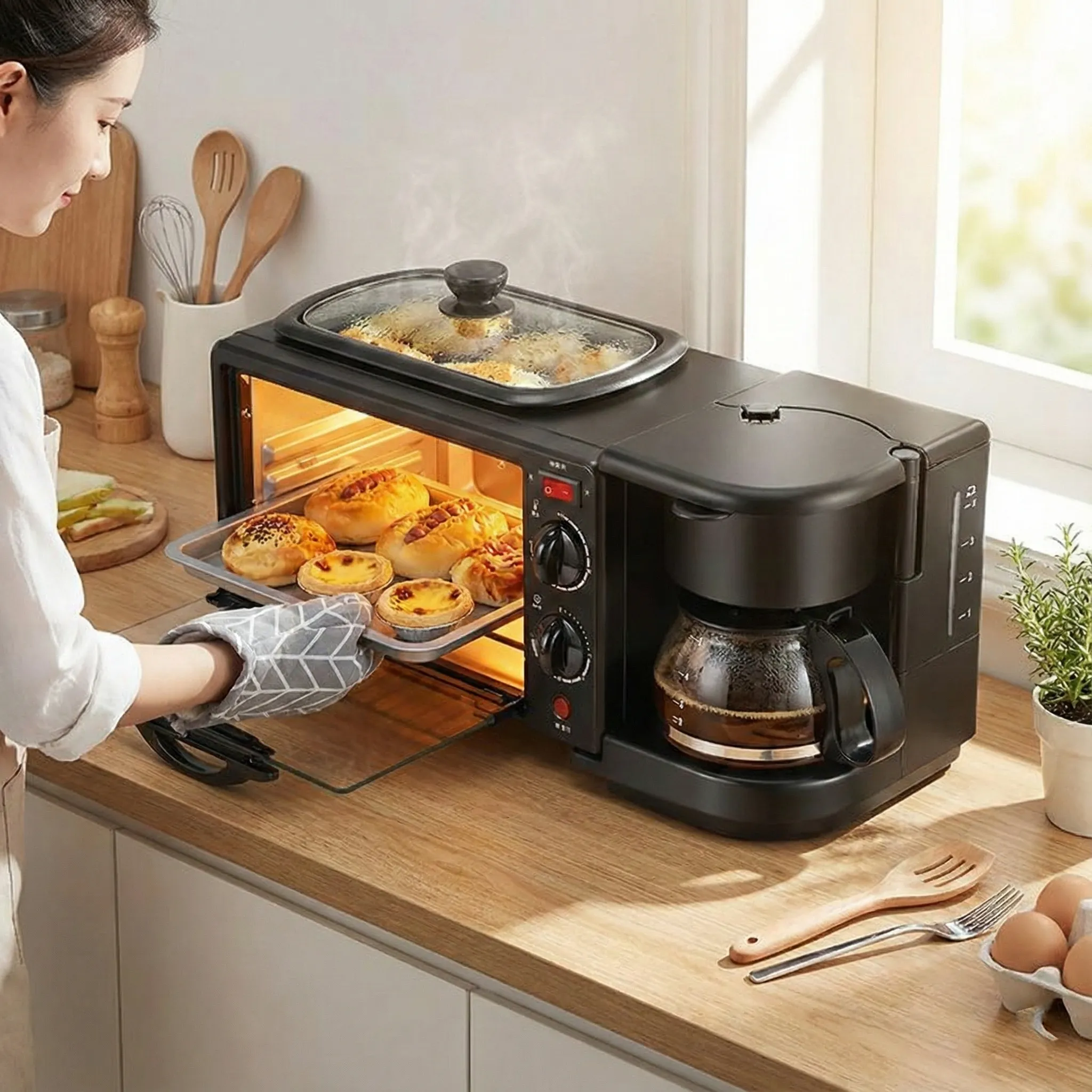 - Tip Produs: Aparat multifuncțional 3-în-1 (Cuptor, Cafetieră, Grill)
