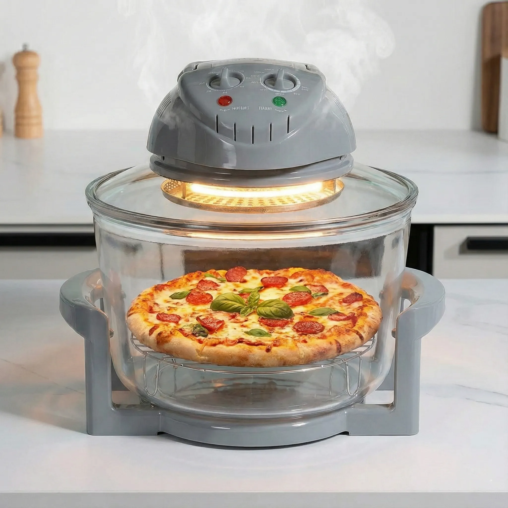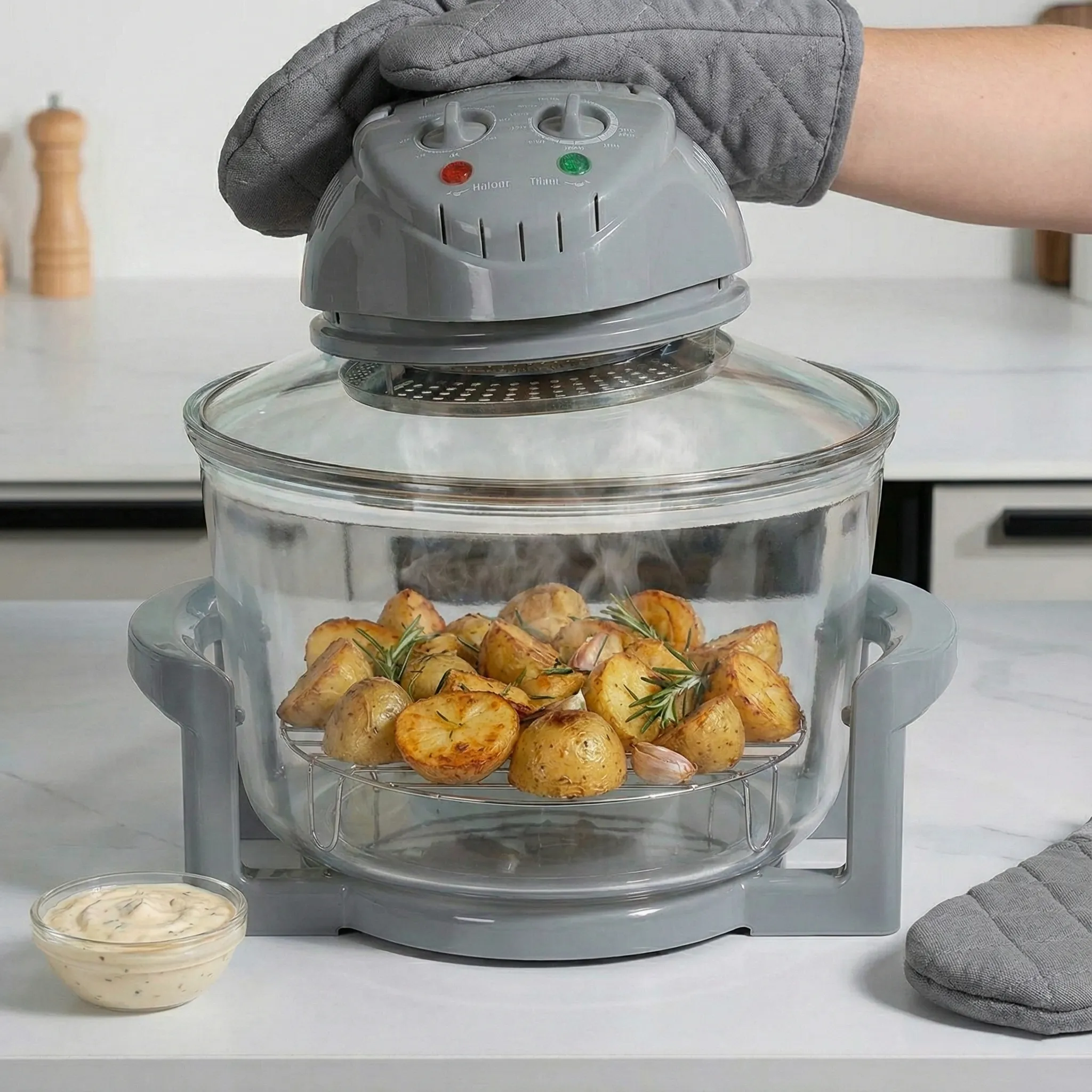 Economisește timp prețios în bucătărie: acest aparat atinge temperatura dorită aproape instantaneu și reduce timpul de gătire cu până la 60% față de metodele tradiționale. Vasul din sticlă termorezistentă îți permite să supraveghezi procesul culinar fără a deschide capacul și a pierde căldură. De la pui întreg și legume, până la prăjituri sau pizza, totul iese perfect.