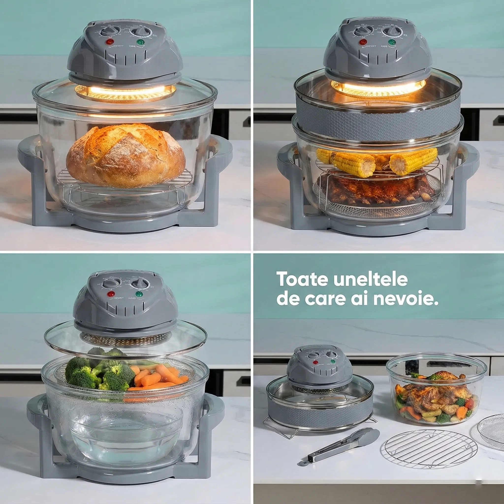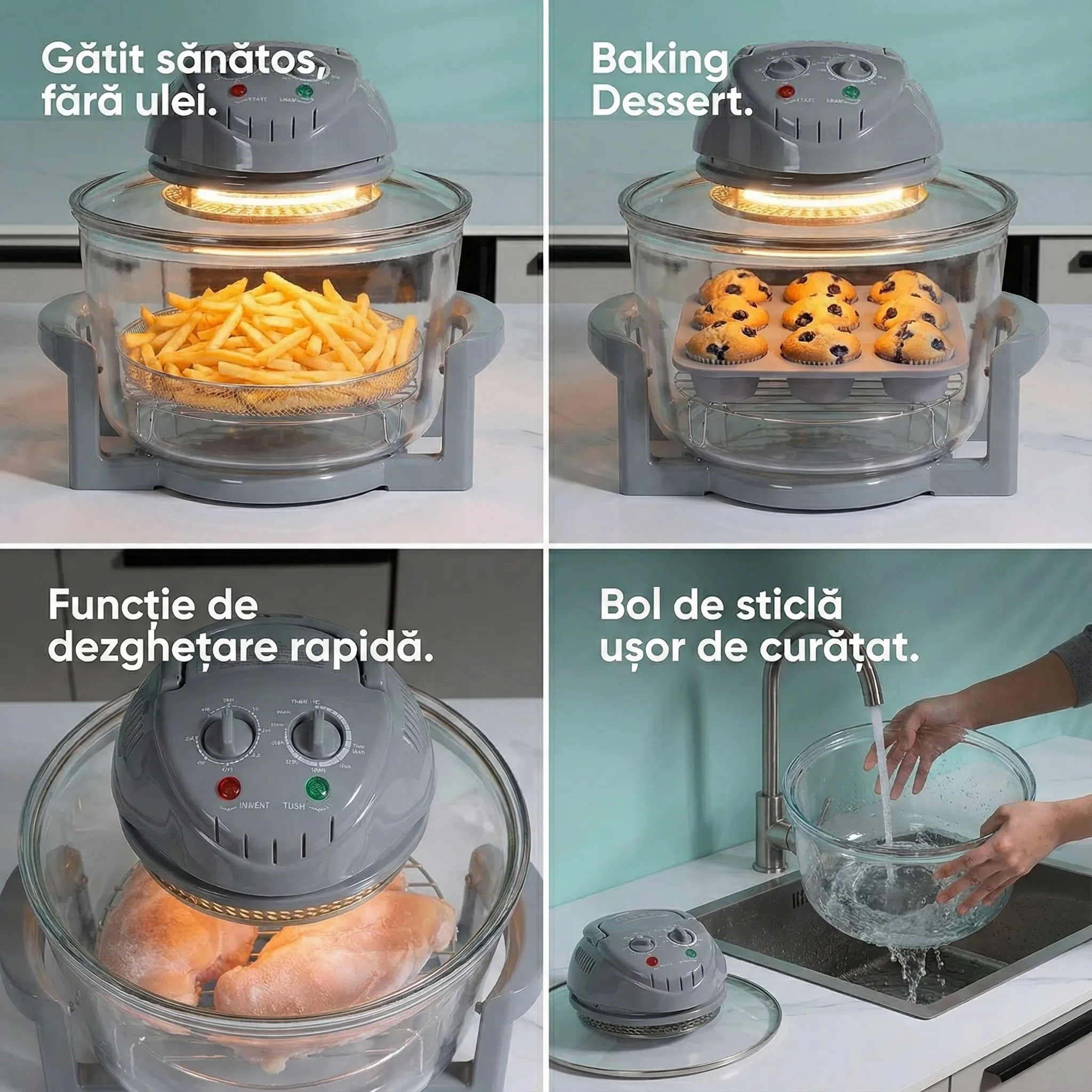 - Beneficii: Gătit fără ulei, economie de timp și energie, autocurățare