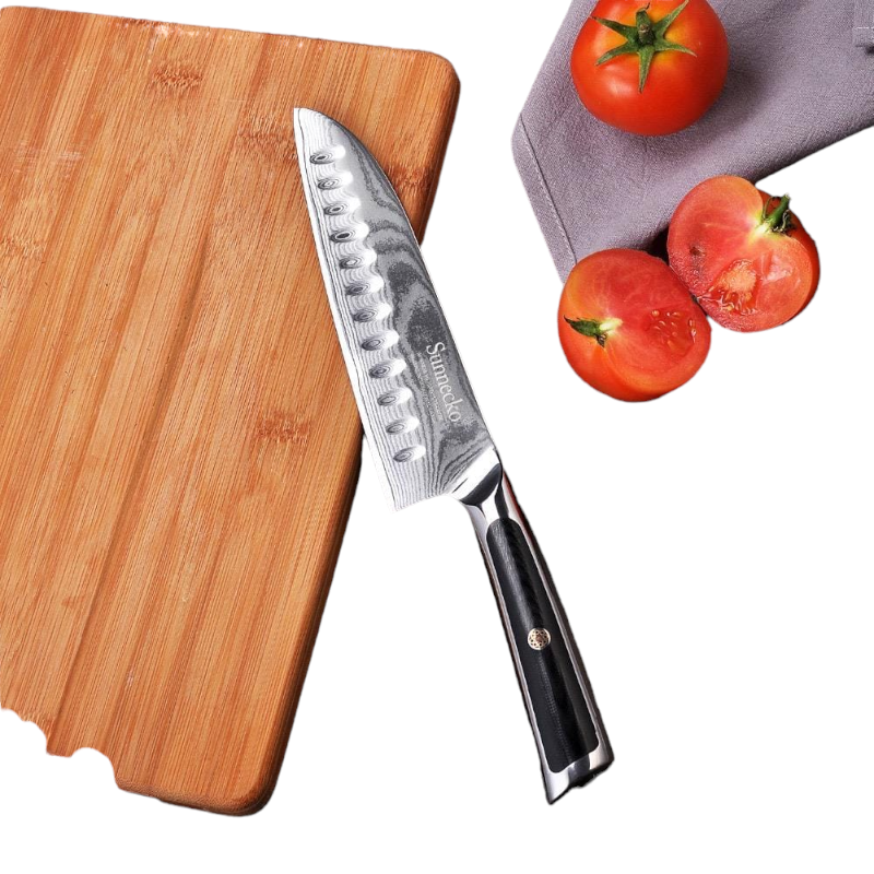 Fabricat integral din inox de înaltă calitate, acest cuțit rezistă excelent la coroziune și la utilizări repetate, menținându-și tăișul ascuțit. Lățimea generoasă a lamei nu doar că oferă o ghidare mai bună în timpul tăierii, dar servește și ca o „lopată” practică pentru a transfera rapid ingredientele tocate direct în oală sau tigaie. Mânerul este conceput ergonomic pentru a asigura o priză sigură, prevenind alunecarea și oferind un echilibru optim între greutate și manevrabilitate.