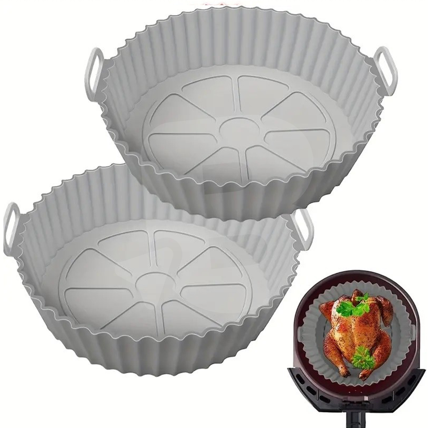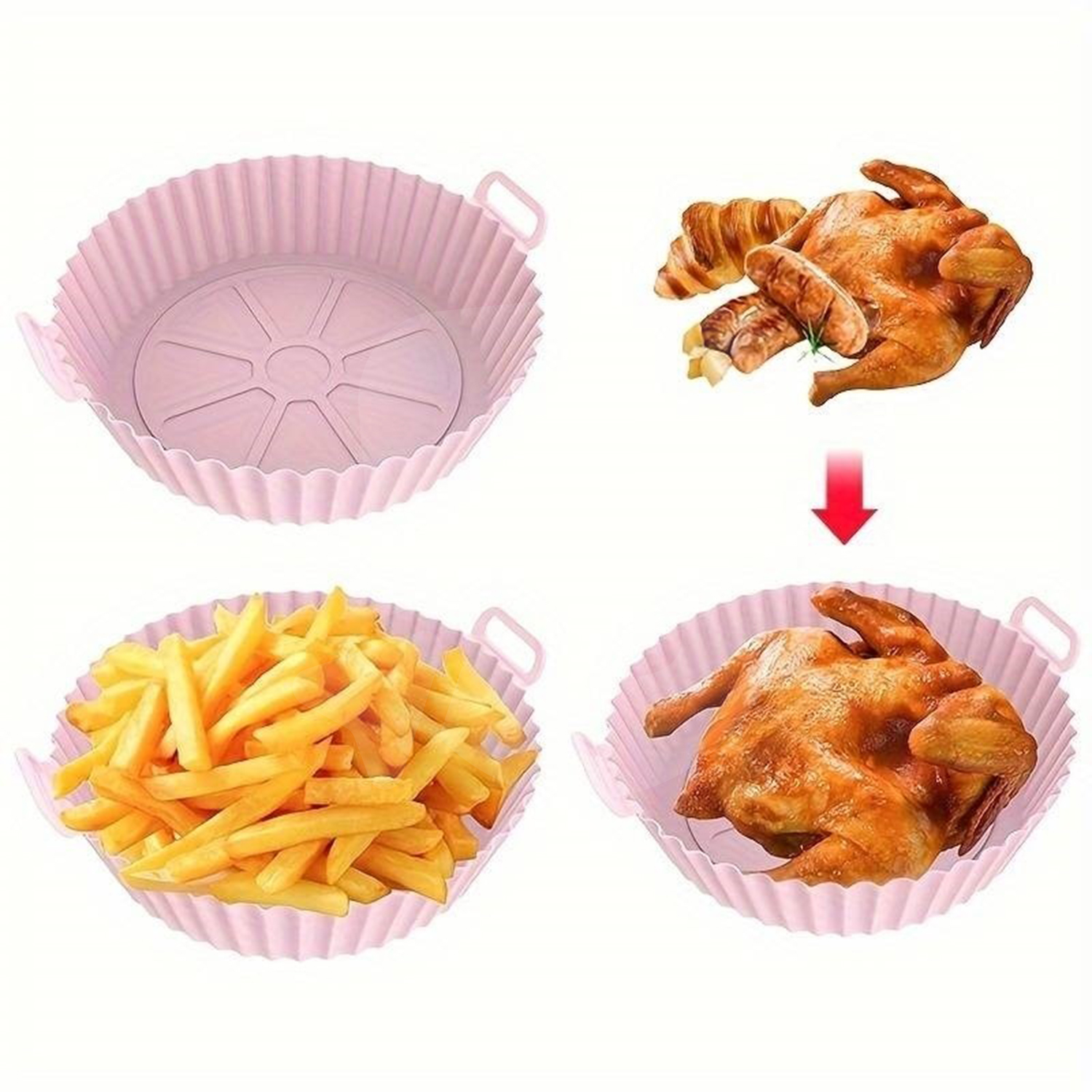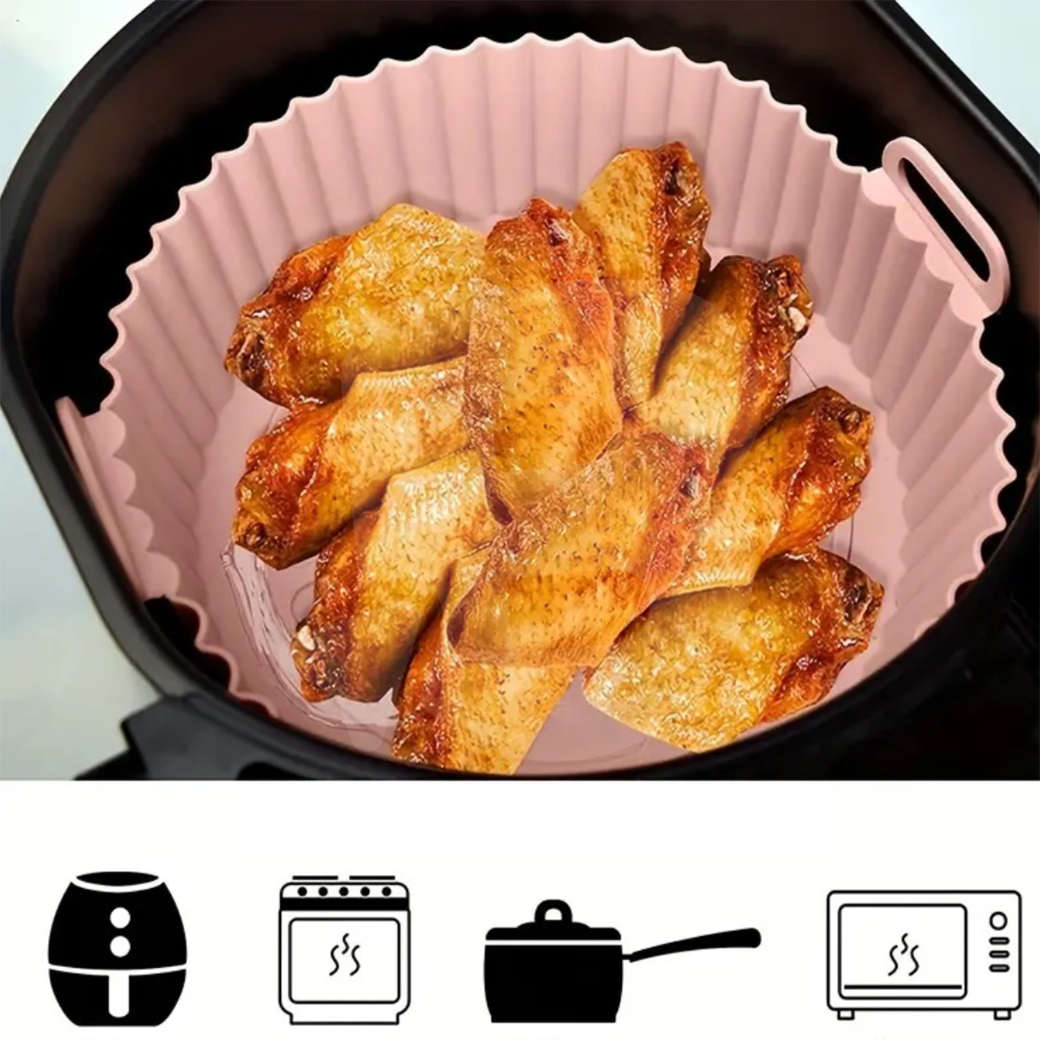 Dimensiunile sunt adaptate friteuzelor cu aer cald de capacitate medie și mare, iar mânerele laterale integrate facilitează manipularea în siguranță, chiar și la temperaturi ridicate. Farfuria poate fi utilizată pentru prepararea cărnii, legumelor, cartofilor prăjiți, aripioarelor, produselor congelate sau a preparatelor semi-preparate.