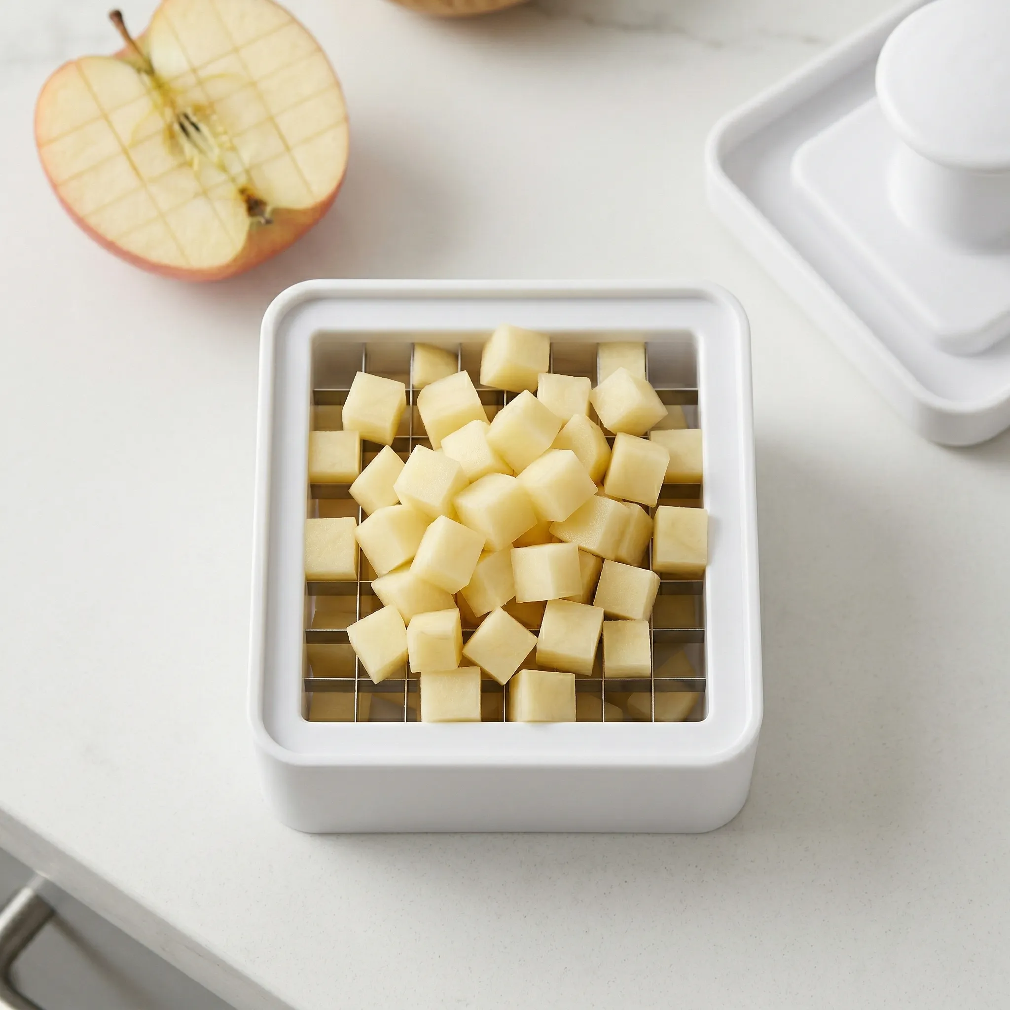 - Fructe: Taie felii uniforme de mere sau pere pentru salate și deserturi;