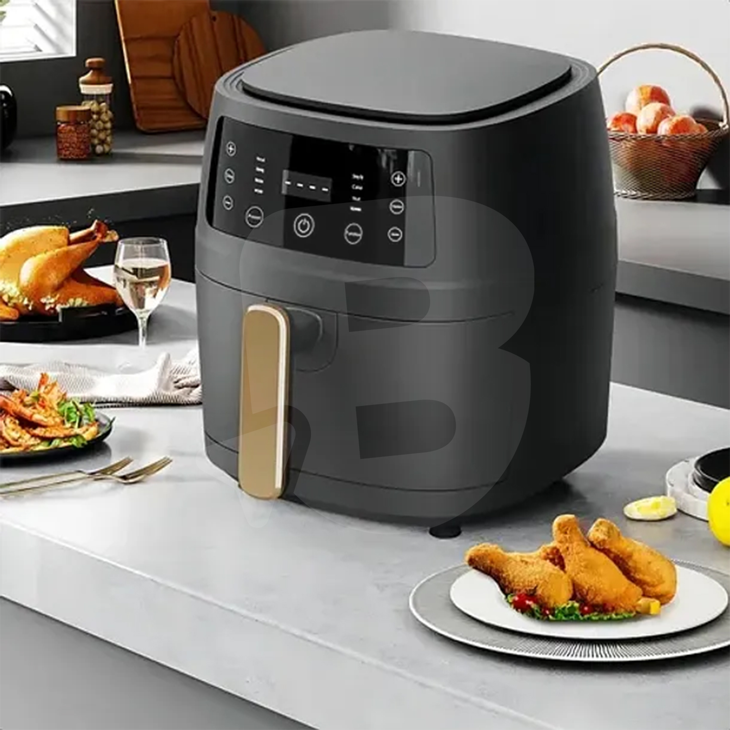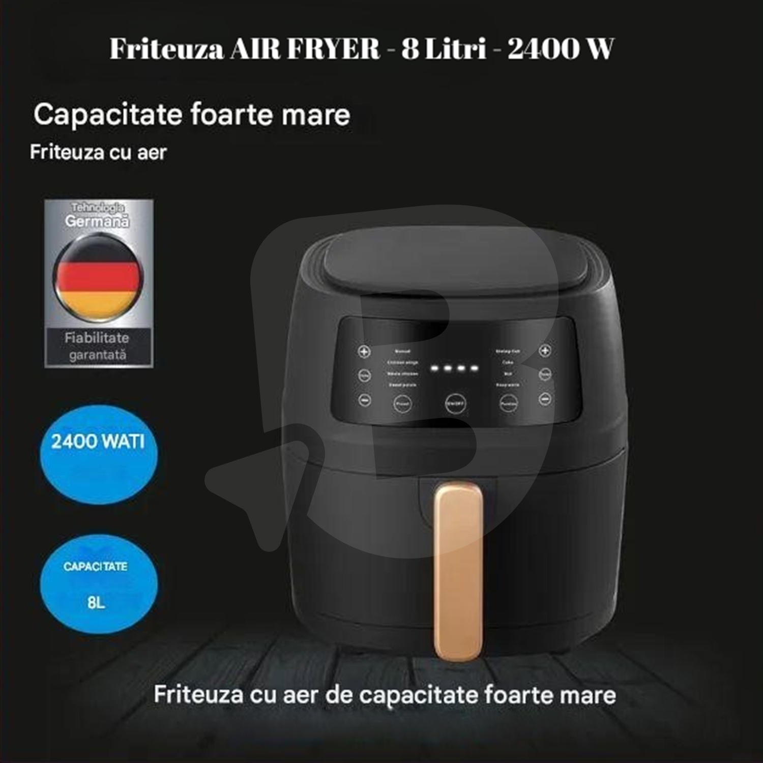 Friteuza Air Fryer digitală de 8 litri și 2400W este soluția ideală pentru gătit rapid, eficient și sănătos, fiind destinată utilizării intensive în gospodării, bucătării moderne și pentru vânzare en-gros către magazine, retaileri și revânzători. Datorită tehnologiei avansate de circulație a aerului cald, preparatele sunt gătite uniform, cu exterior crocant și interior fraged, folosind cu până la 80% mai puțin ulei sau chiar deloc.