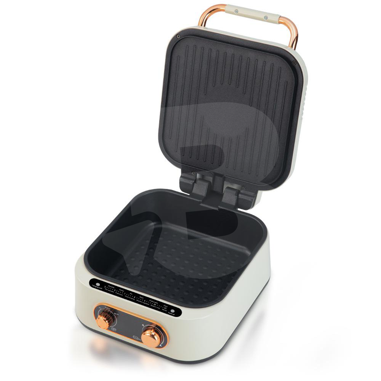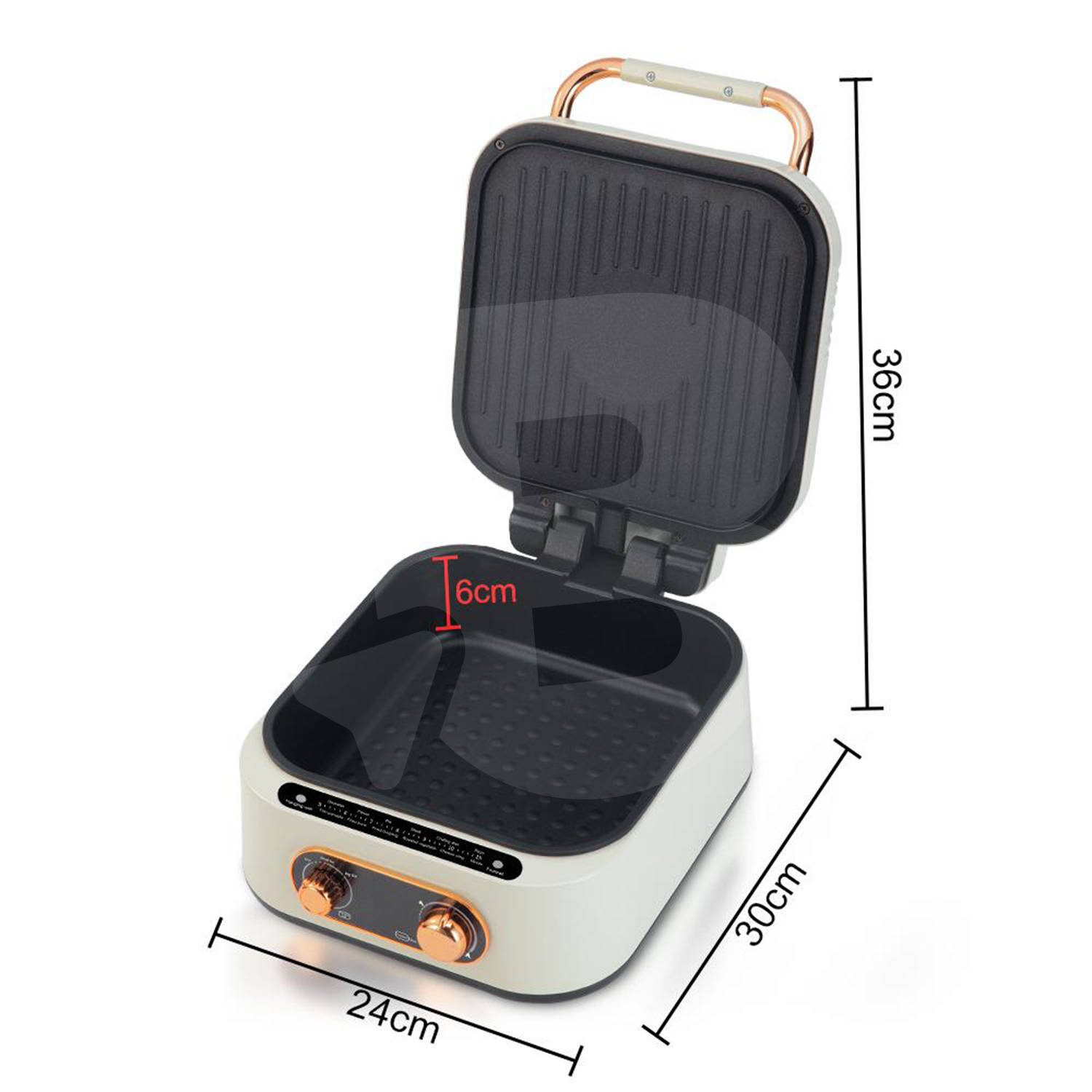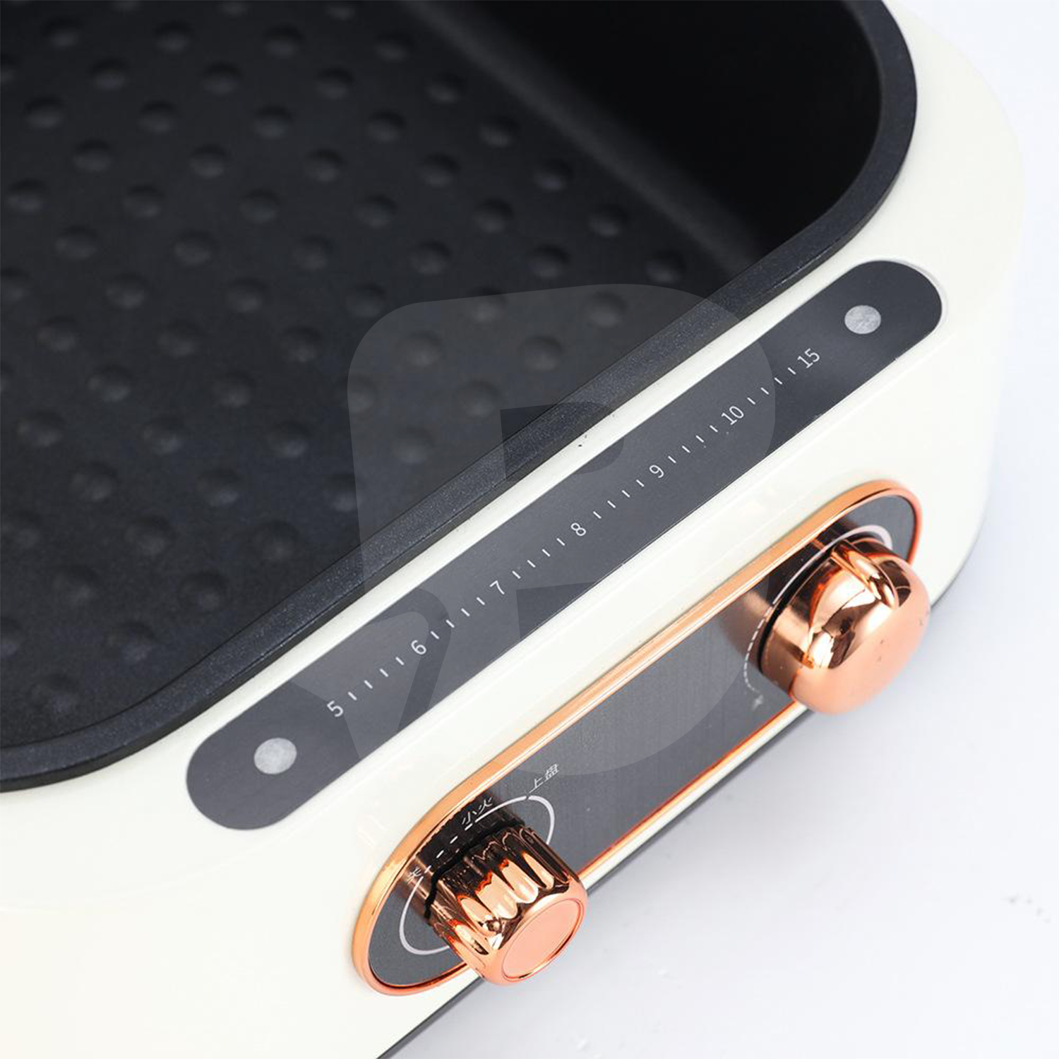 Aparatul este echipat cu un sistem de încălzire electrică pe două fețe, care asigură distribuția uniformă a temperaturii atât în vasul principal, cât și pe placa superioară de grill. Puterea de 1800W permite atingerea rapidă a temperaturii de lucru, reducând timpul de gătire și consumul inutil de energie. Controlul temperaturii este mecanic, realizat prin două butoane frontale independente, ușor de utilizat și fiabile în timp.