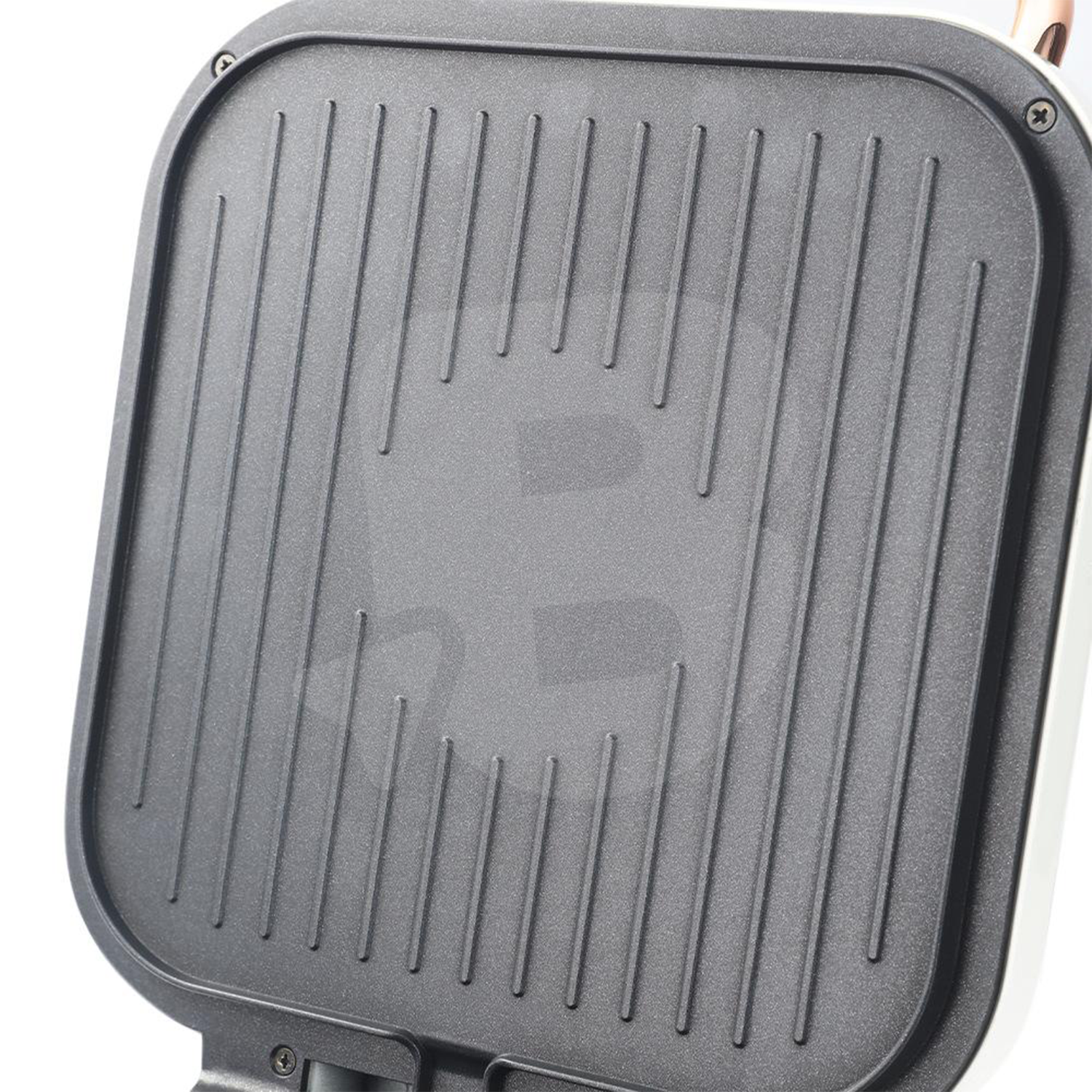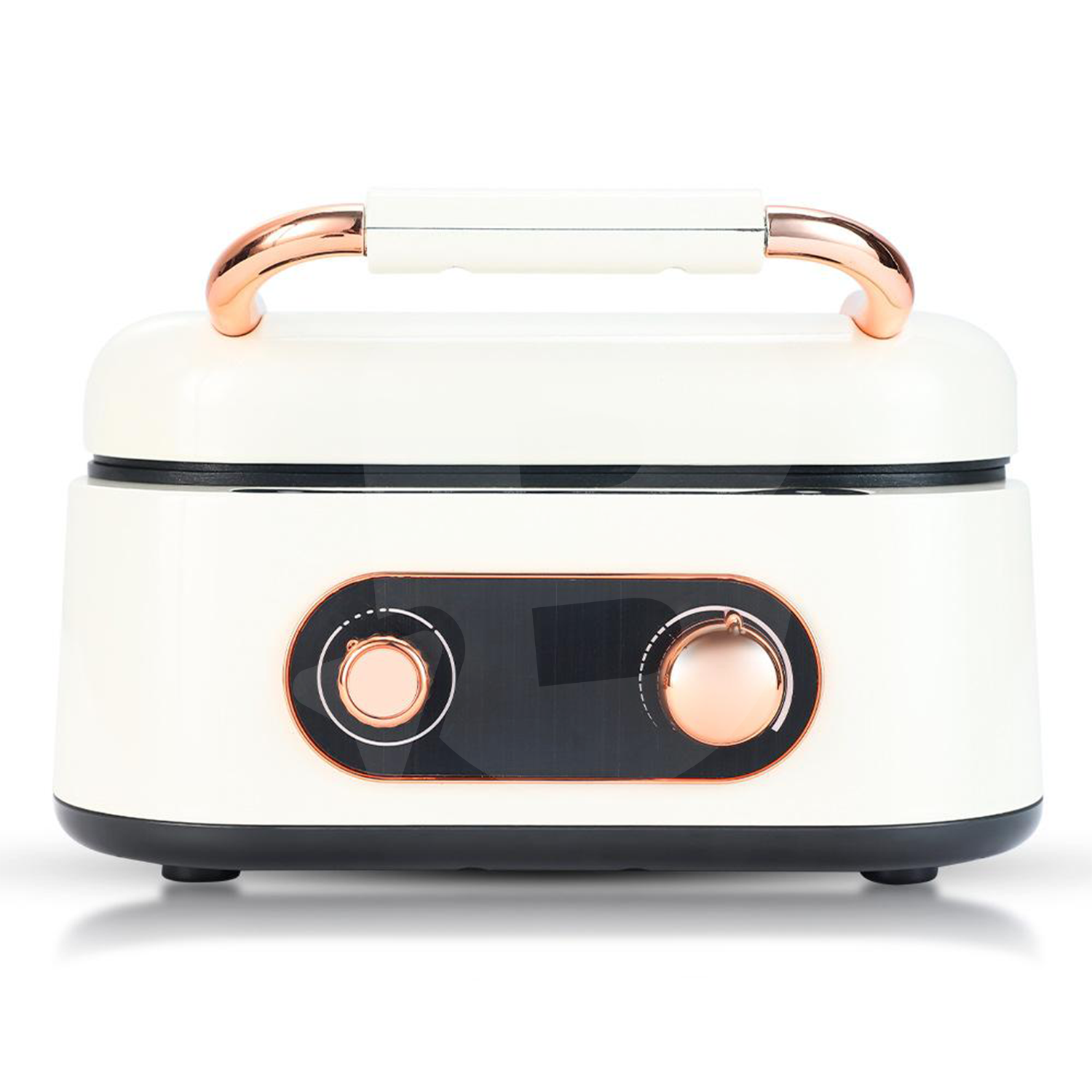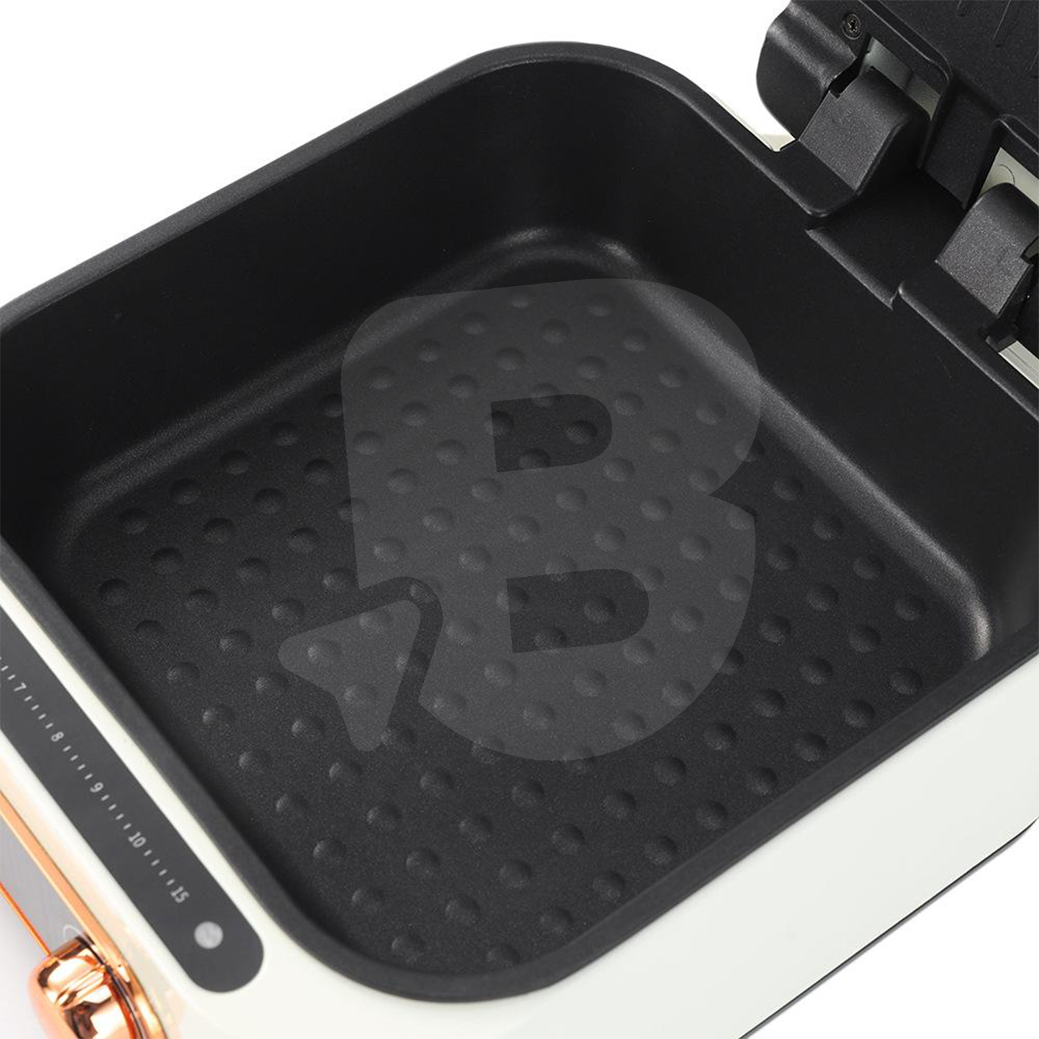 Aparatul este echipat cu un sistem de încălzire electrică pe două fețe, care asigură distribuția uniformă a temperaturii atât în vasul principal, cât și pe placa superioară de grill. Puterea de 1800W permite atingerea rapidă a temperaturii de lucru, reducând timpul de gătire și consumul inutil de energie. Controlul temperaturii este mecanic, realizat prin două butoane frontale independente, ușor de utilizat și fiabile în timp.