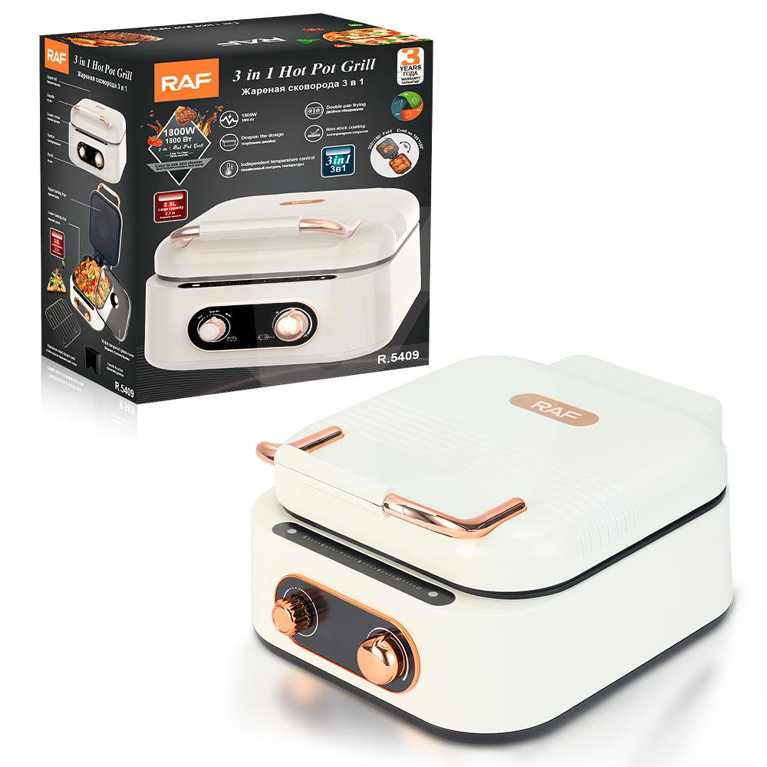 Multicooker-ul electric RAF® 3 în 1 Hot Pot Grill și tigaie dublă este un aparat multifuncțional destinat gătitului rapid și eficient, conceput pentru utilizare zilnică în bucătării moderne, spații comerciale, unități HoReCa mici sau pentru achiziție en-gros. Dispozitivul combină într-un singur echipament funcțiile de hot pot, grill și tigaie adâncă, permițând prepararea unei game variate de mâncăruri fără a folosi mai multe aparate separate.