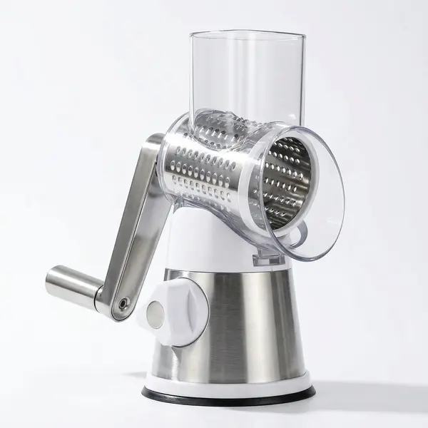 Siguranță și Stabilitate de Neclintit Uită de dispozitivele care alunecă pe blat! Această răzătoare este dotată cu o bază cu ventuză puternică, care se fixează ferm pe orice suprafață netedă printr-o simplă rotire. Designul cu manivelă protejează complet mâinile, deoarece alimentele sunt împinse prin tubul superior, eliminând contactul direct al degetelor cu lamele ascuțite.