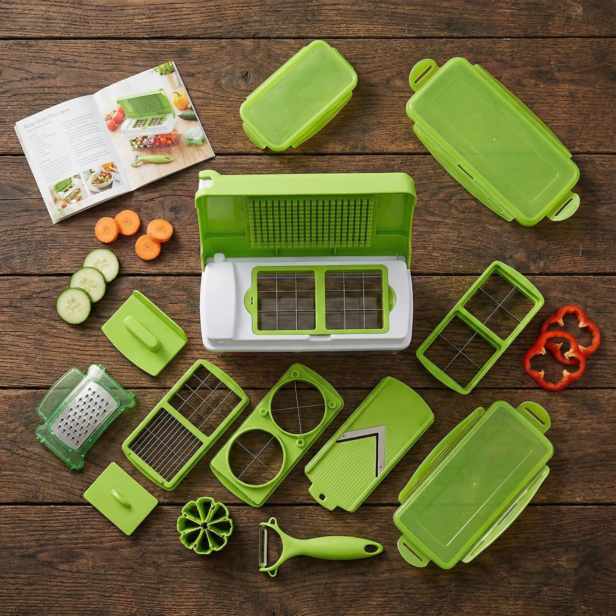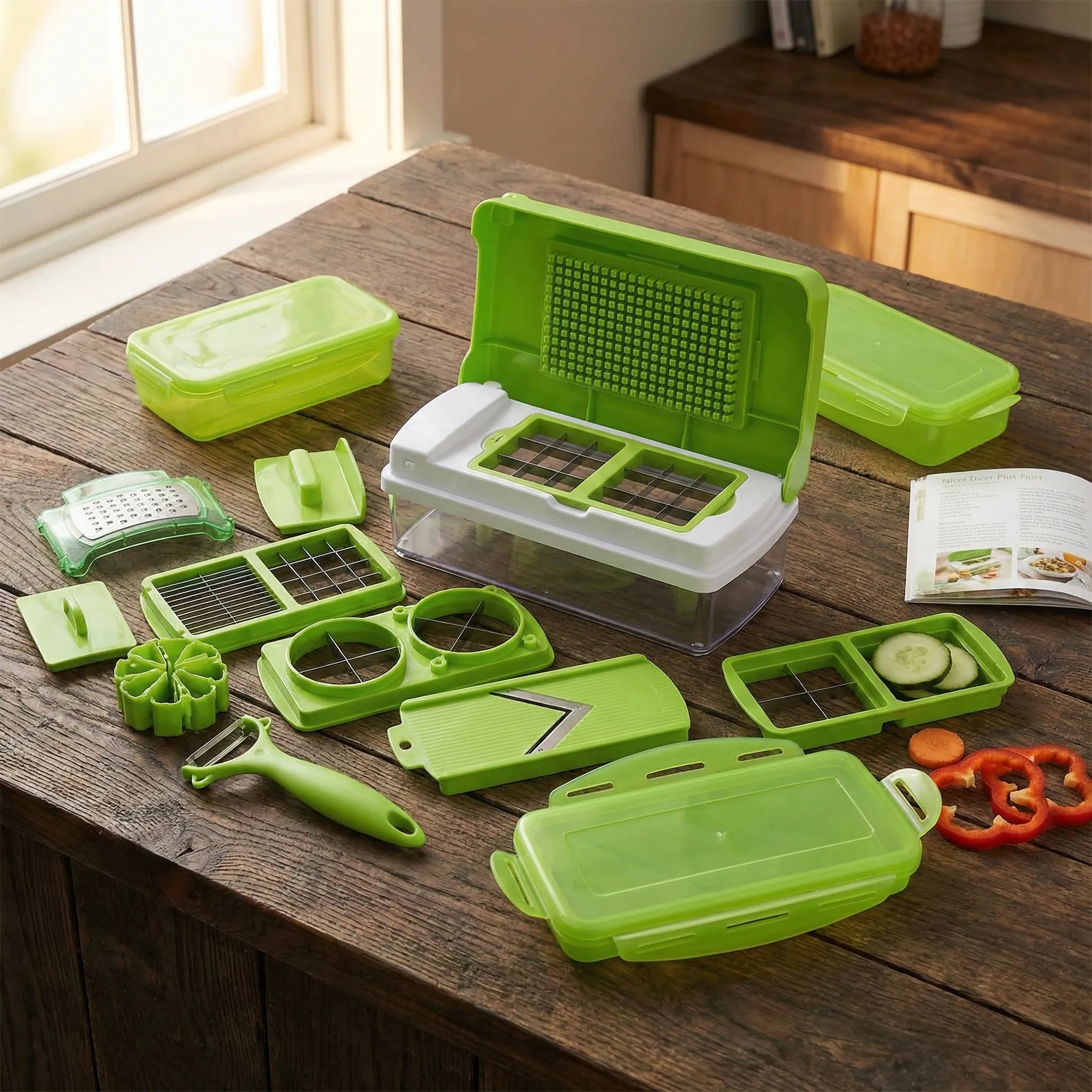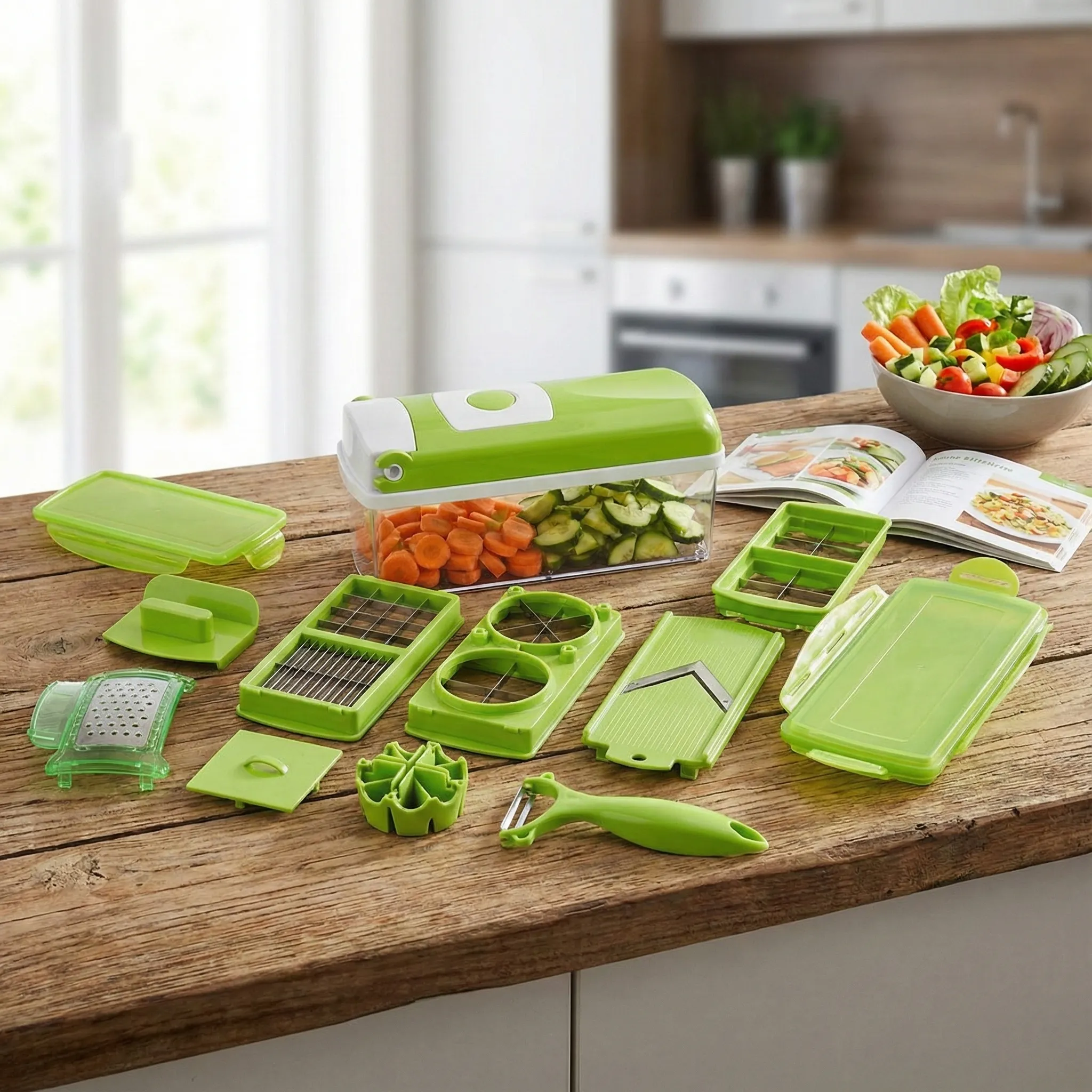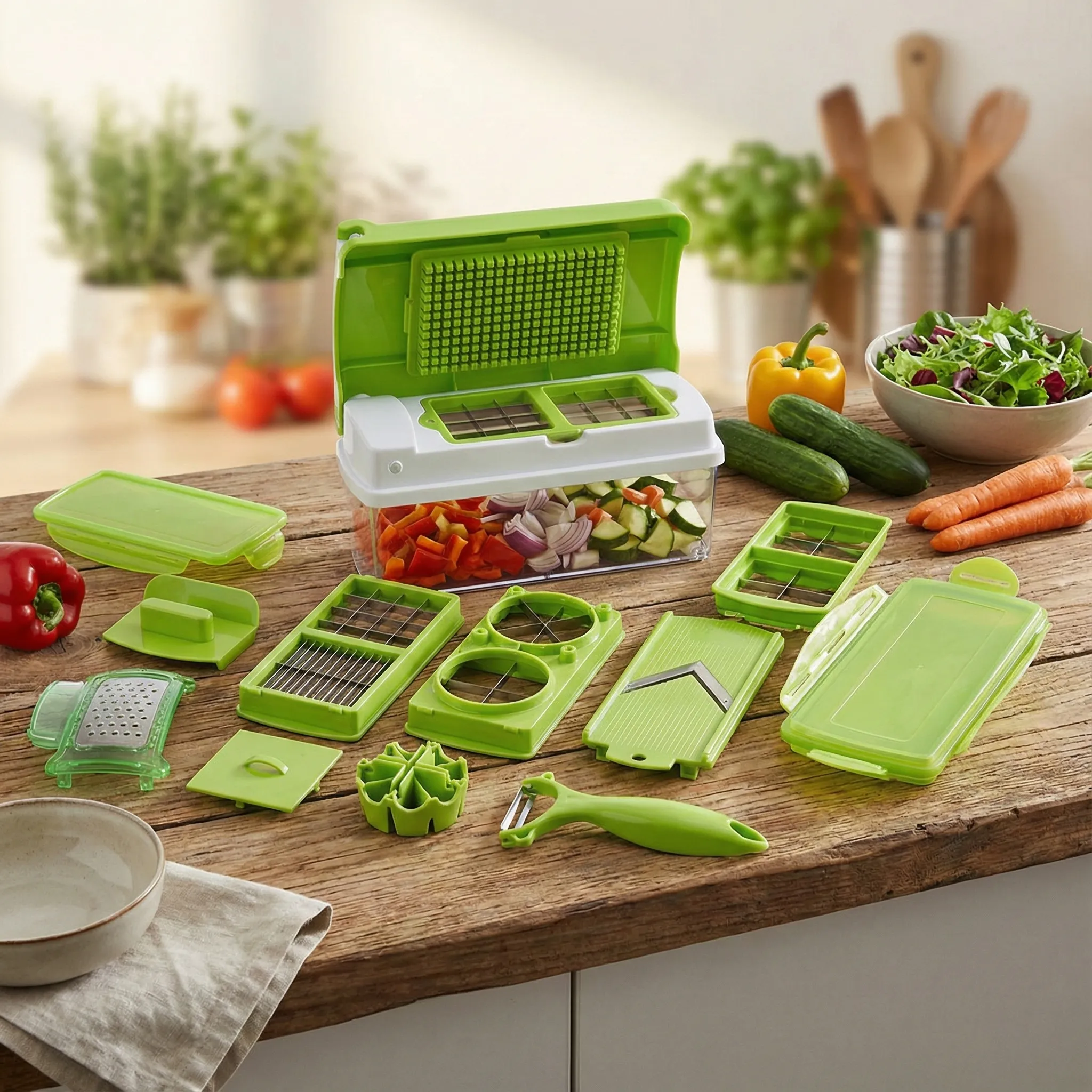 Design Inteligent și Depozitare Directă (Dorință): Unul dintre cele mai mari avantaje este recipientul transparent inclus. Toate legumele cad direct în cutia de colectare, eliminând murdăria de pe blat. Capacul cu balamale și sistemul de tăiere rapidă fac ca totul să fie extrem de intuitiv. Mai mult, poți servi direct din recipient sau poți păstra alimentele proaspete în frigider folosind capacul etanș.