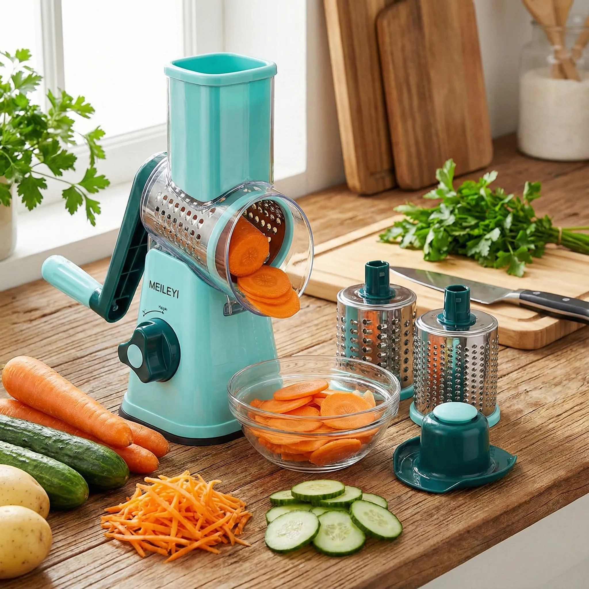 Versatilitate 5-în-1 pentru Orice Rețetă: Pachetul include 3 lame principale plus 2 accesorii specializate pentru ras fin și feliat. Poți trece instant de la felierea castraveților pentru murături la mărunțirea fină a brânzei sau a nucilor, oferind varietate și textură preparatelor tale.
