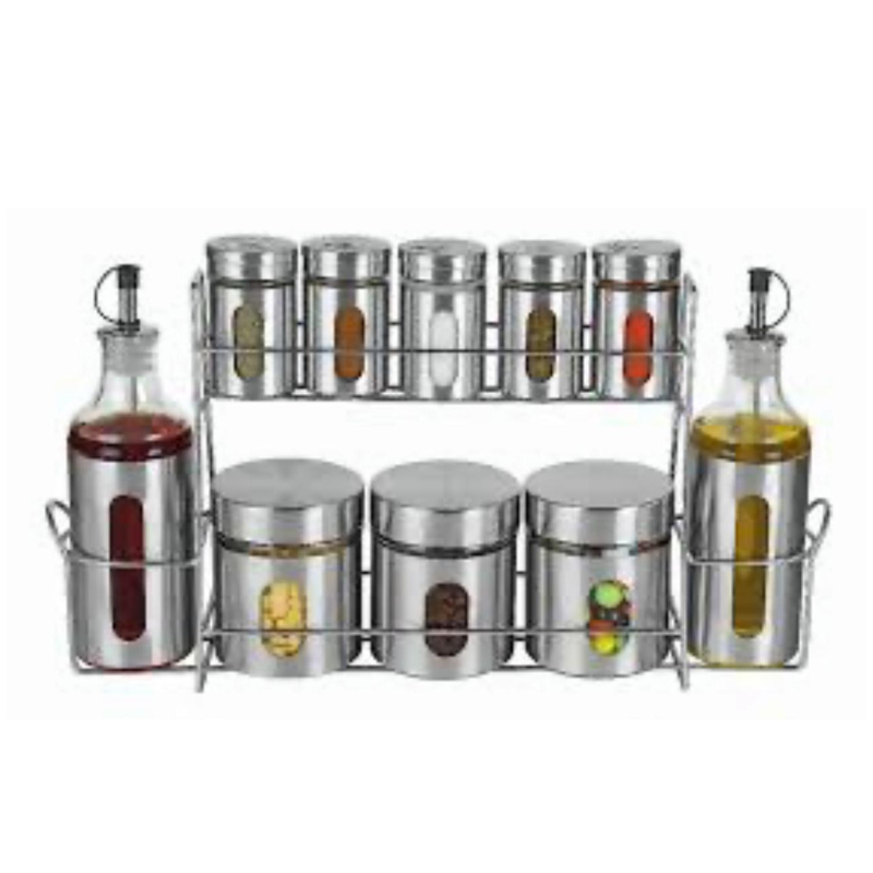 Organizați-vă masa într-un mod elegant și funcțional cu acest set complet de 10 piese pentru condimente și oliviere. Proiectat pentru a satisface toate nevoile unei familii sau ale unui restaurant, setul include recipiente esențiale pentru ulei, oțet, sare, piper și diverse condimente, toate grupate pe un suport ergonomic care facilitează transportul și depozitarea.