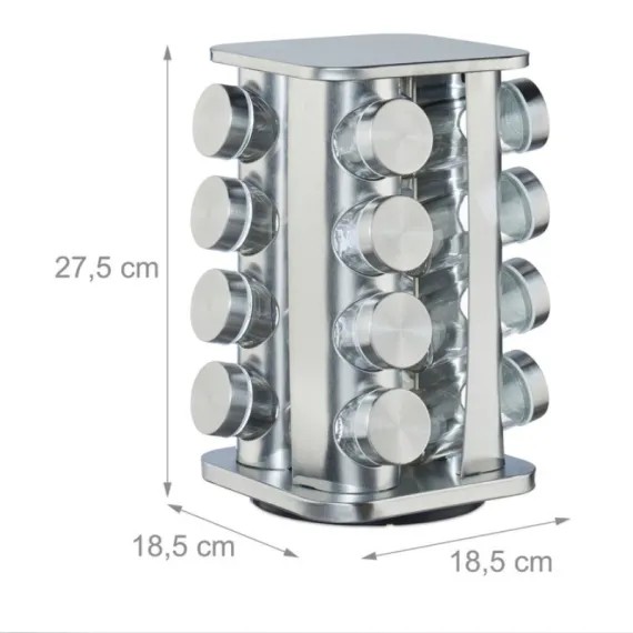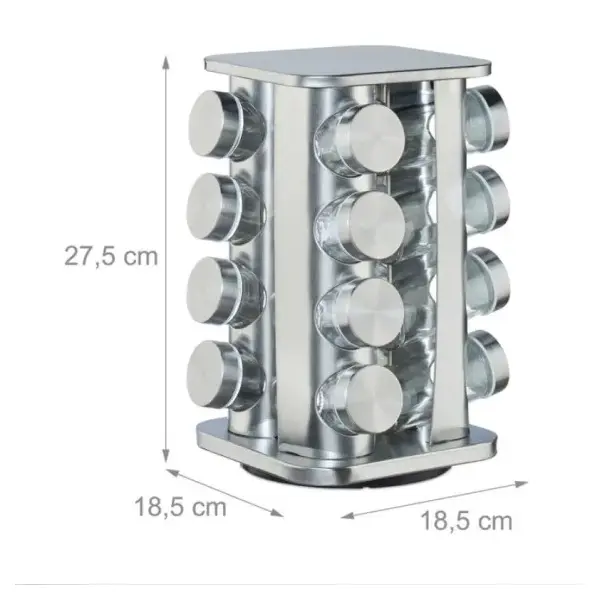 Cele 16 recipiente din sticlă sunt transparente, facilitând identificarea rapidă a conținutului. Capacele din inox se înfiletează sigur, contribuind la păstrarea prospețimii condimentelor și la protecția împotriva umezelii sau a mirosurilor externe. Dimensiunile sunt echilibrate pentru a găzdui cantități suficiente de condimente, fiind potrivite pentru rotație rapidă în spații comerciale sau pentru utilizare constantă în bucătării active.