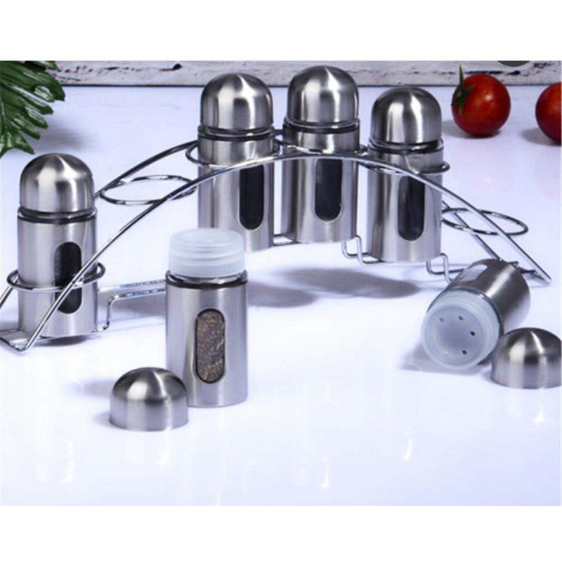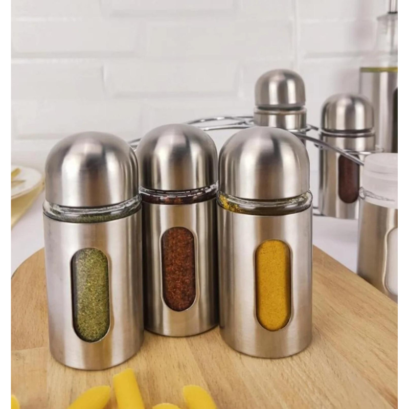Capacele metalice sunt prevăzute cu orificii de precizie, asigurând o dozare controlată a condimentelor la fiecare utilizare. Suportul central, realizat din oțel rezistent, nu doar că păstrează masa ordonată, dar dispune și de un mâner practic în partea superioară, facilitând transportul setului de la bucătărie direct la masă. Baza suportului este stabilă, prevenind răsturnarea accidentală a recipientelor.