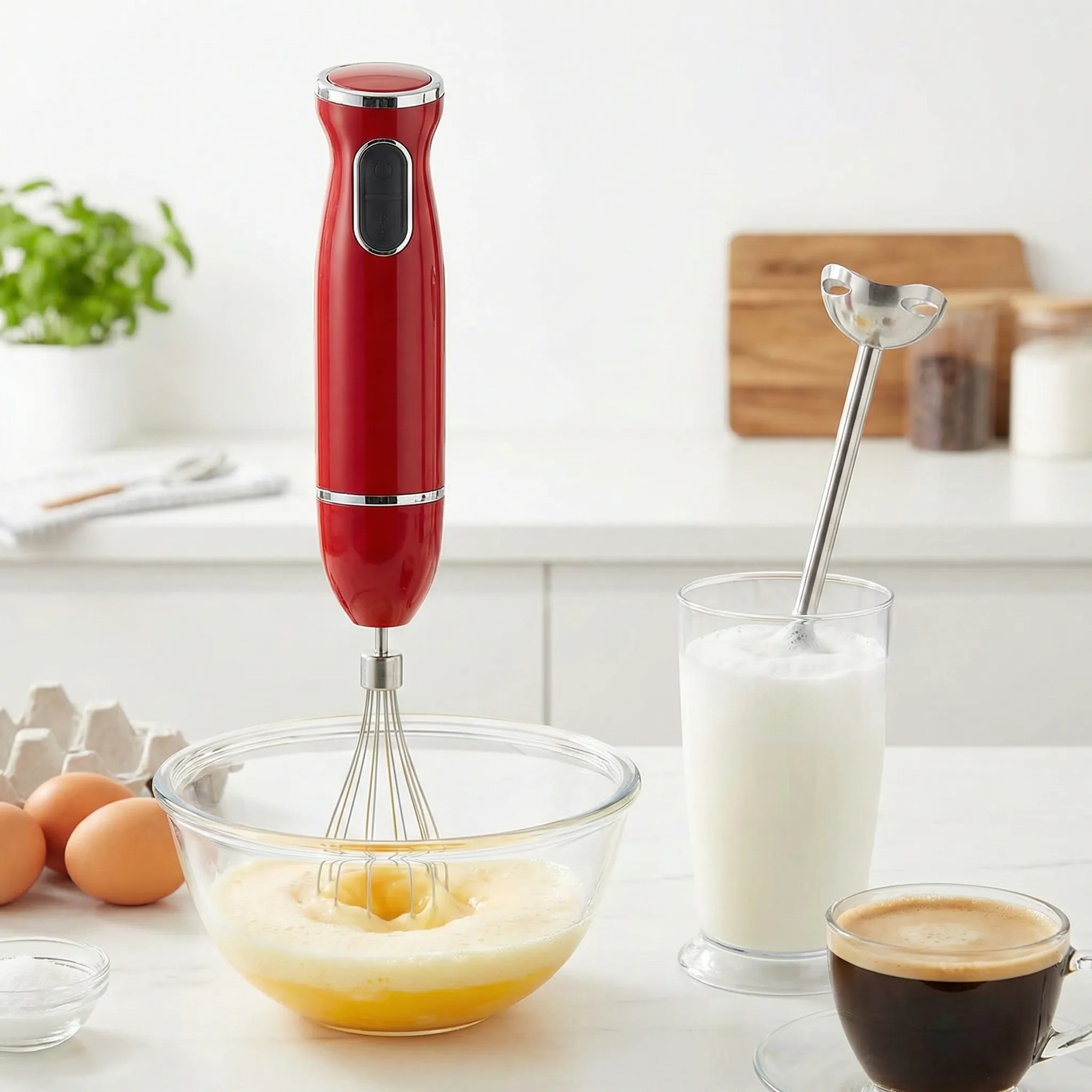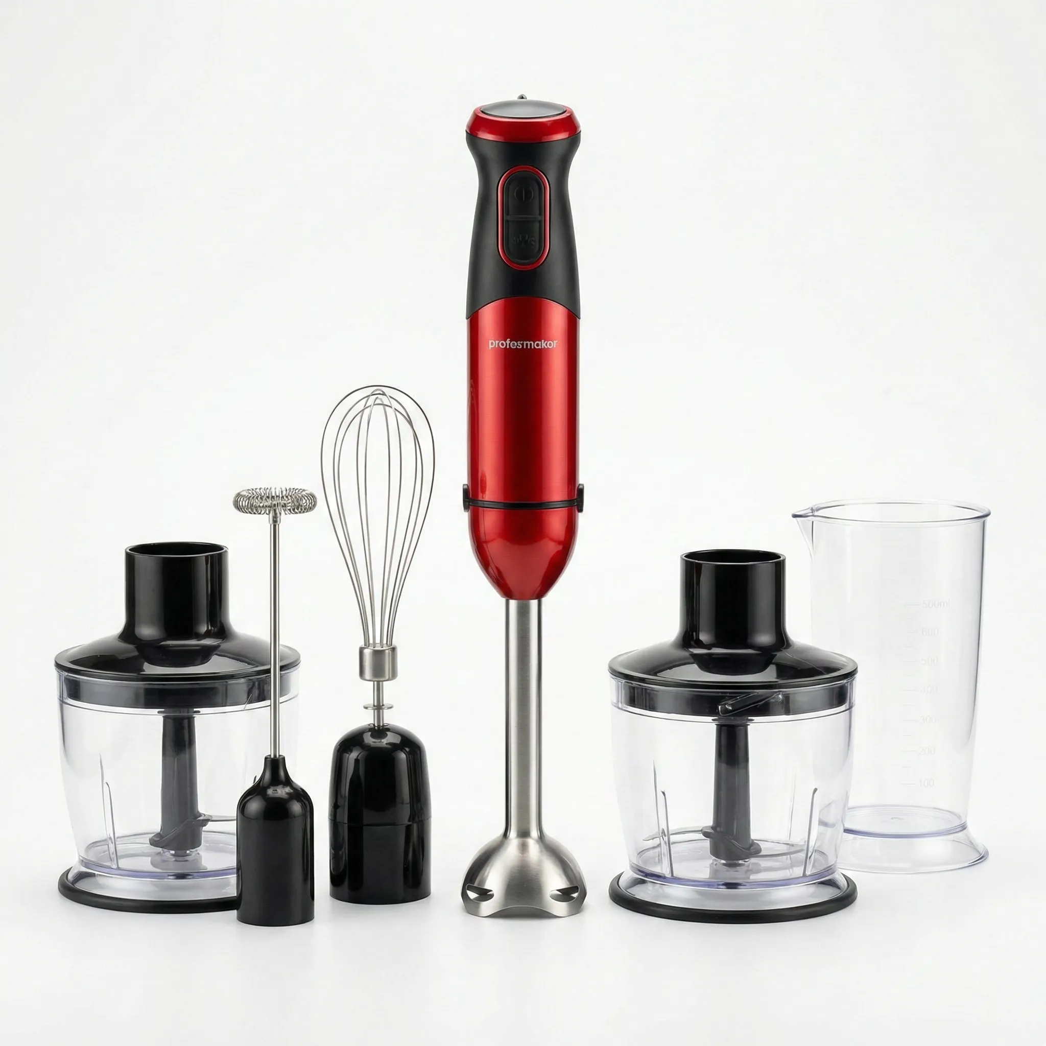 Transformă-ți bucătăria într-un spațiu modern și eficient cu Blenderul de Mână Profesional 5 în 1. Cu o putere de 500W și o culoare roșu vibrant, acest aparat nu este doar un accesoriu elegant, ci o unealtă puternică proiectată să facă față celor mai diverse provocări culinare. Fie că ești pasionat de supe cremoase, deserturi rafinate sau băuturi pe bază de cafea, acest set îți oferă versatilitatea de care ai nevoie.