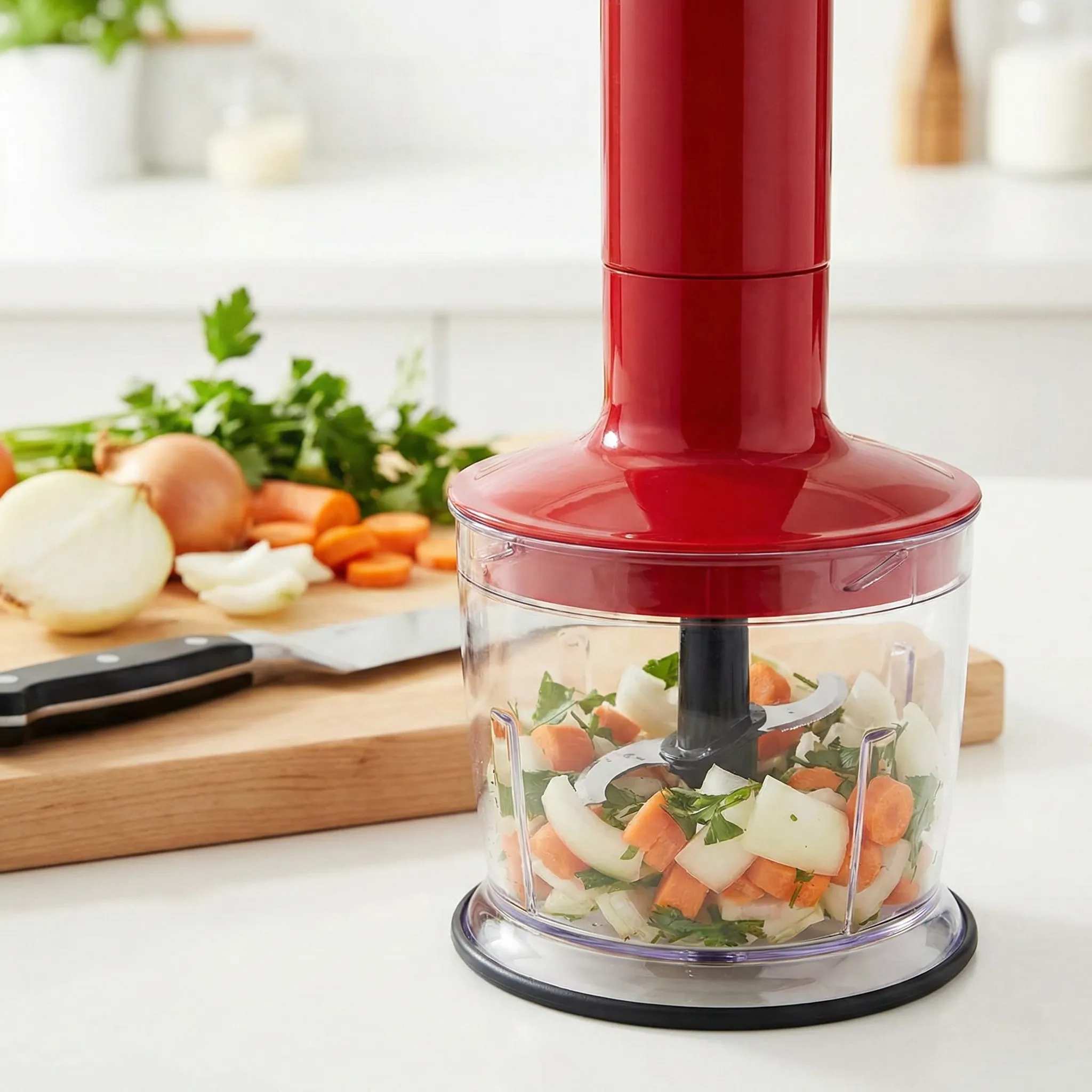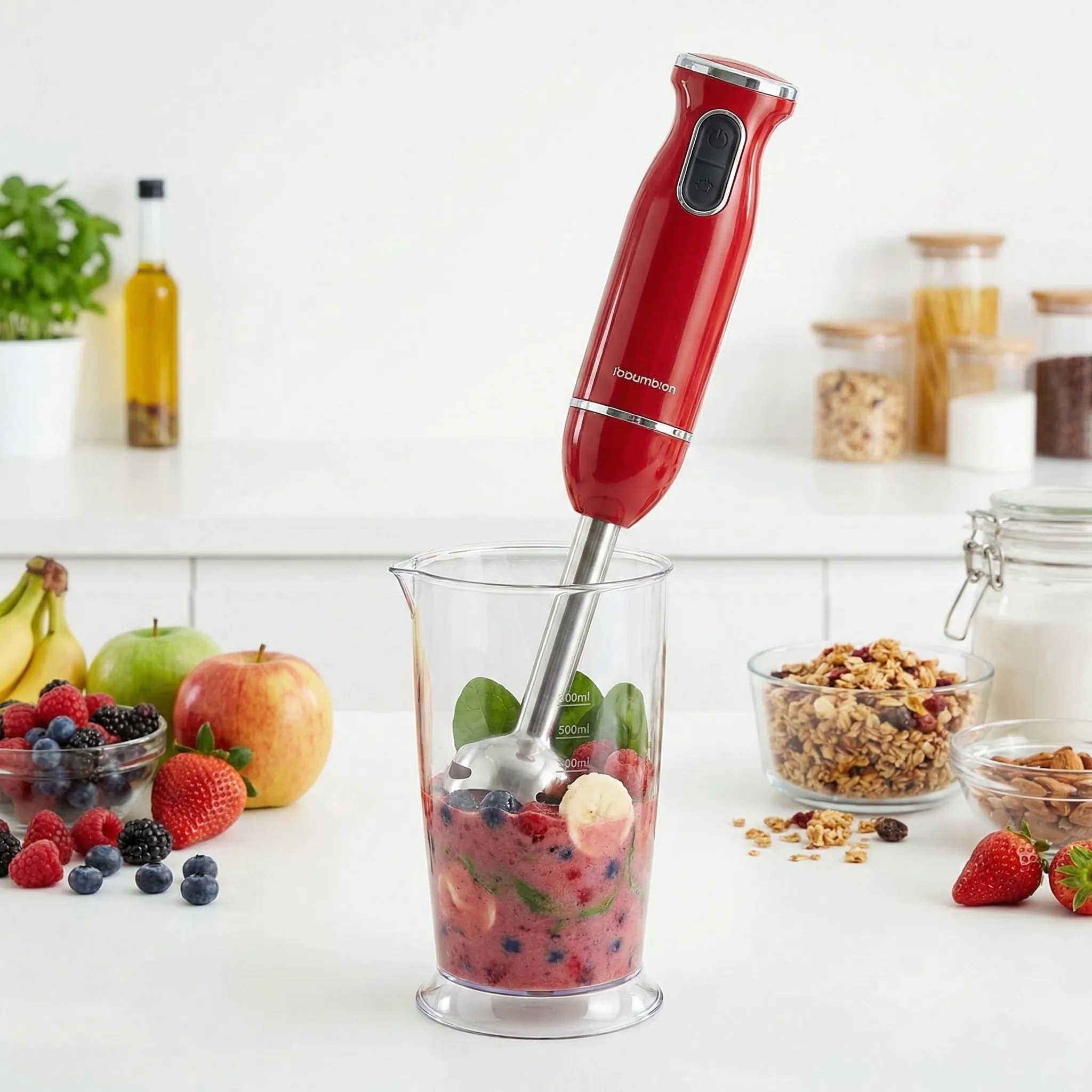 - Sistem 5 în 1 Complet: Nu mai ai nevoie de mai multe aparate care ocupă spațiu. Setul include un tocător de 500 ml pentru legume sau nuci, un tel pentru compoziții pufoase, un accesoriu de mixare verticală și o cană gradată de 500 ml.