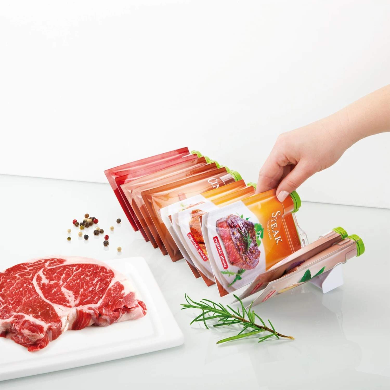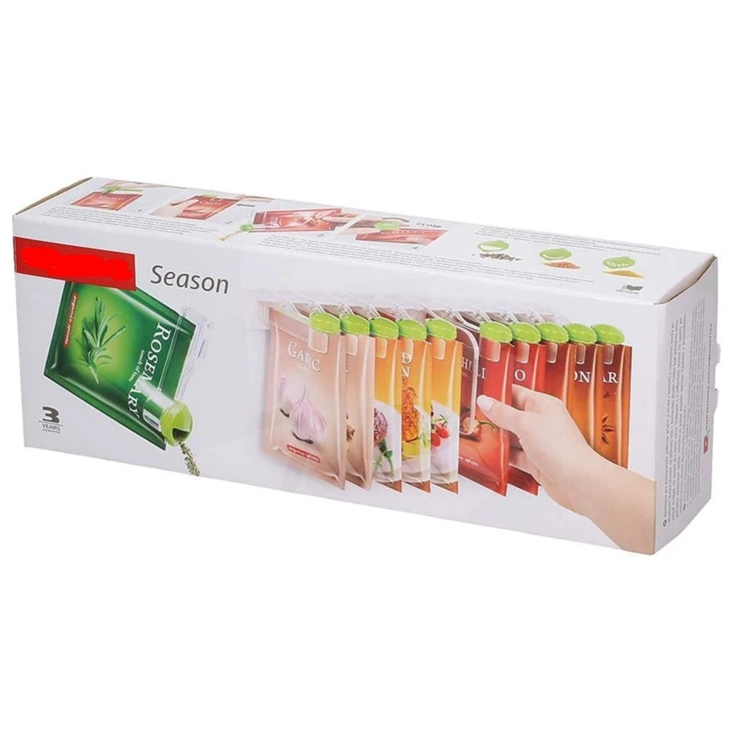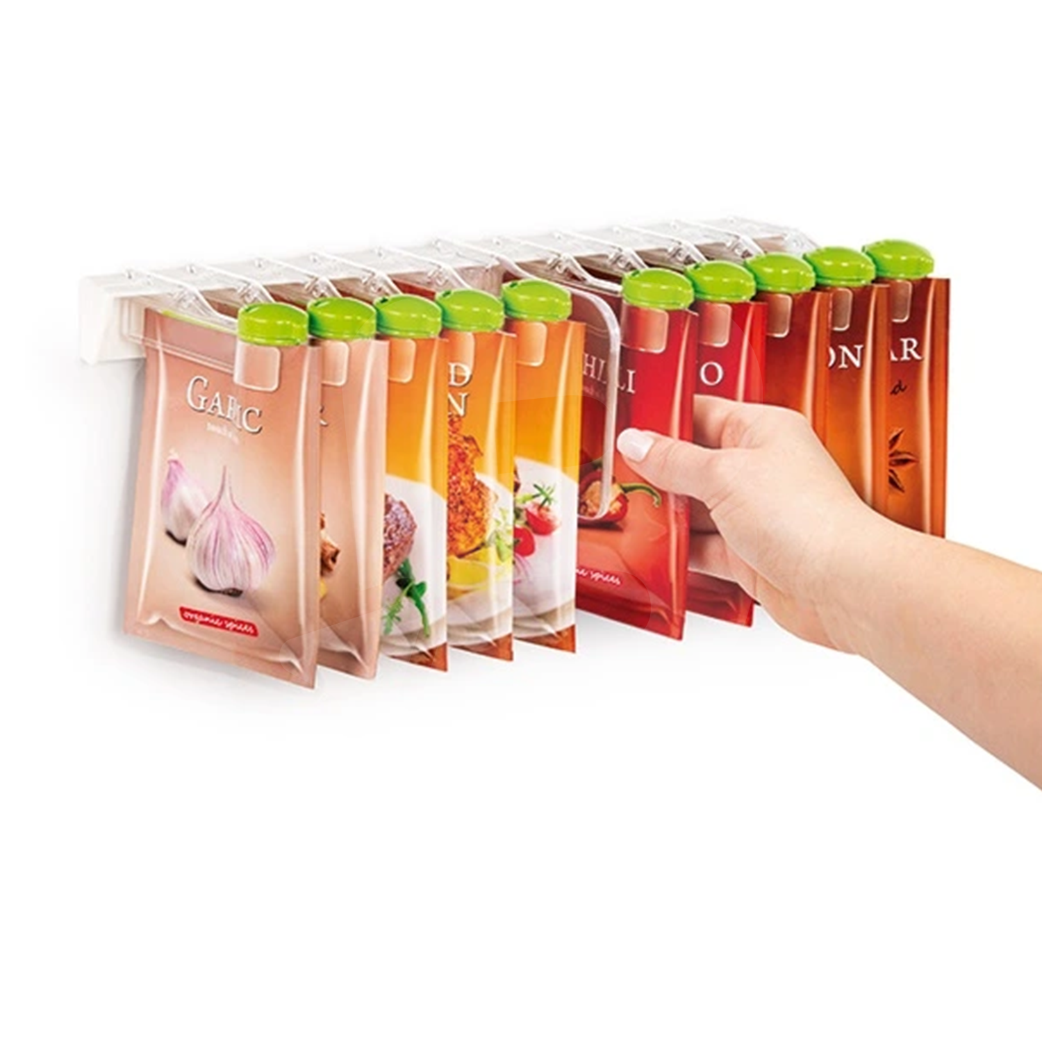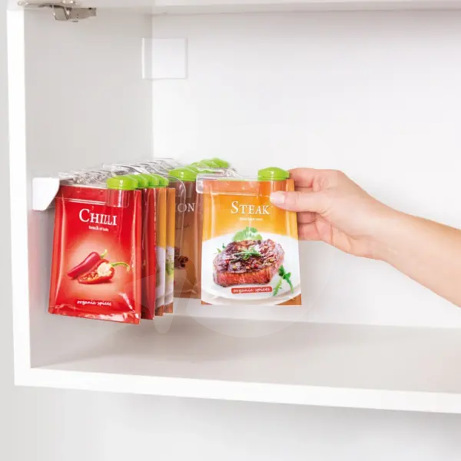 Suportul inclus permite fixarea simultană a celor 10 plicuri, fiecare putând fi detașat individual sau mutat împreună cu suportul. Sistemul este ideal pentru rafturi, dulapuri sau spații de lucru, oferind vizibilitate clară asupra condimentelor utilizate frecvent precum sare, piper, chilli, usturoi, oregano, rozmarin sau mixuri de condimente.