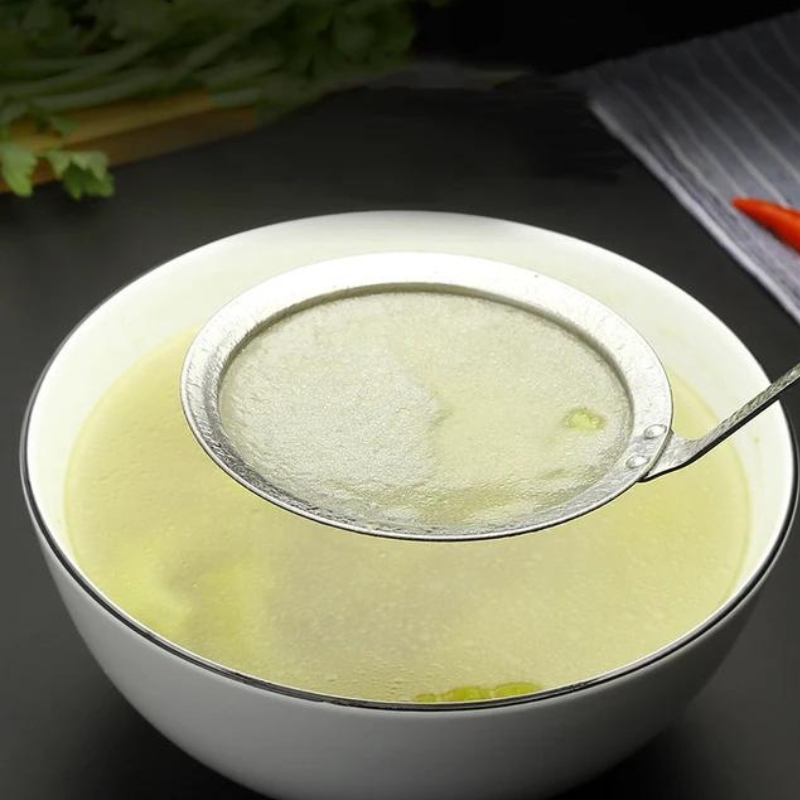 Dimensiunea de 34 x 12 cm oferă o suprafață generoasă de filtrare, permițând strecurarea rapidă a lichidelor și separarea eficientă a impurităților sau a spumei rezultate în timpul fierberii. Plasa fină din oțel este ideală pentru îndepărtarea spumei din supe și ciorbe, pentru strecurarea fondurilor, a sosurilor sau pentru cernerea ingredientelor lichide fără a pierde consistența dorită.