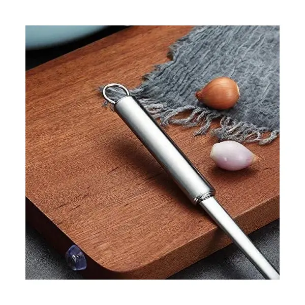 Mânerul lung și ergonomic este realizat tot din inox și oferă o prindere sigură și confortabilă. Designul cilindric al mânerului asigură stabilitate în utilizare, iar capătul prevăzut cu orificiu permite agățarea spumierei pentru depozitare ușoară. Din imaginile produsului se observă finisajul metalic mat, care contribuie atât la aspectul profesional, cât și la ușurința în curățare.