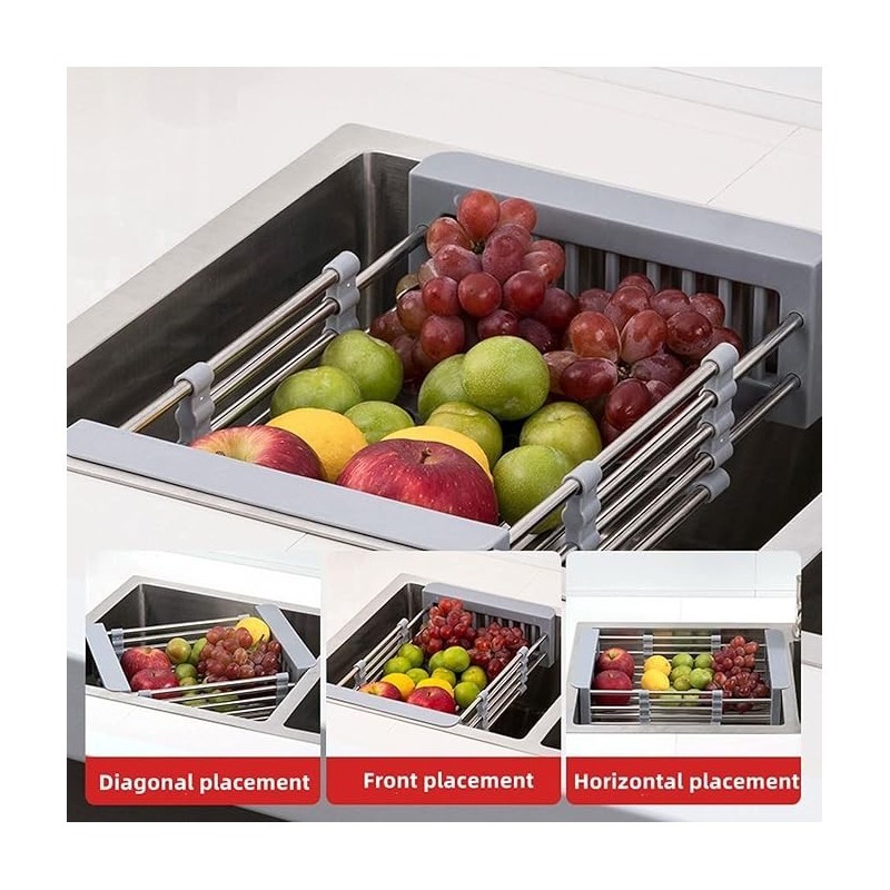 Structura suportului este realizată din bare metalice din inox, rezistente la umezeală, coroziune și uzură zilnică. Elementele laterale sunt fabricate din material plastic solid, cu prindere sigură pe marginile chiuvetei, asigurând stabilitate chiar și atunci când suportul este încărcat cu vase, fructe sau ustensile. Finisajul gri neutru se integrează ușor în orice tip de bucătărie modernă sau clasică.
