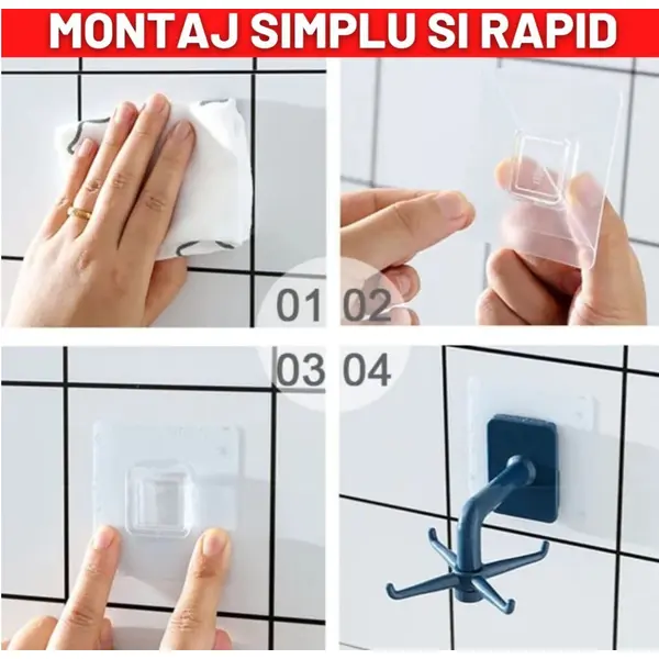Sistemul de montaj autoadeziv este un avantaj major pentru utilizarea en-gros, deoarece nu necesită unelte, șuruburi sau găurirea pereților. Instalarea se face rapid: suprafața se curăță, se aplică suportul autoadeziv transparent, se presează ferm, iar după fixare suportul rotativ este gata de utilizare. Acest tip de prindere îl face ideal pentru suprafețe precum faianță, sticlă, metal, MDF sau lemn neted.