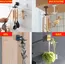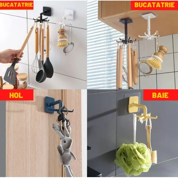 Construcția suportului este realizată din material plastic rezistent, cu o bază solidă și cârlige distribuite radial, care permit agățarea simultană a mai multor obiecte. Mecanismul rotativ facilitează accesul rapid la fiecare element, eliminând dezordinea și optimizând fluxul de lucru în bucătărie sau baie. Din imaginile produsului se observă clar utilizarea pentru ustensile de gătit cu mâner din lemn, perii, site, teluri, dar și pentru accesorii de baie sau chei în zona de hol.