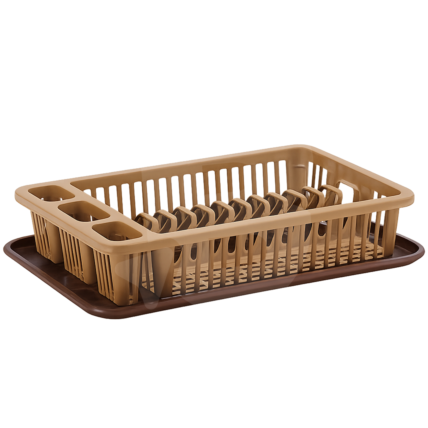 Fabricat din plastic rezistent de calitate superioară, suportul este conceput să reziste la utilizare zilnică fără a se deforma sau a-și pierde stabilitatea sub greutatea veselei. Compartimentarea este gândită strategic pentru a maximiza fluxul de aer: dispune de o secțiune dedicată pentru farfurii, care le menține într-o poziție verticală sigură, și de 3 compartimente speciale pentru tacâmuri, asigurând scurgerea apei de pe linguri, furculițe sau cuțite. Designul modern, disponibil în nuanțe calde de maro sau bej, permite integrarea facilă în orice decor, de la bucătării rustice la spații culinare contemporane.