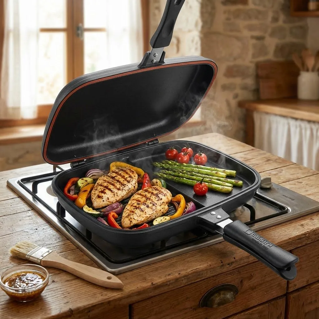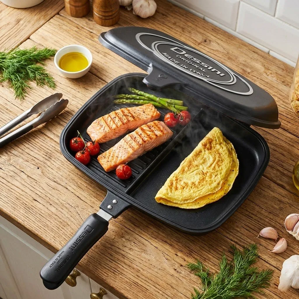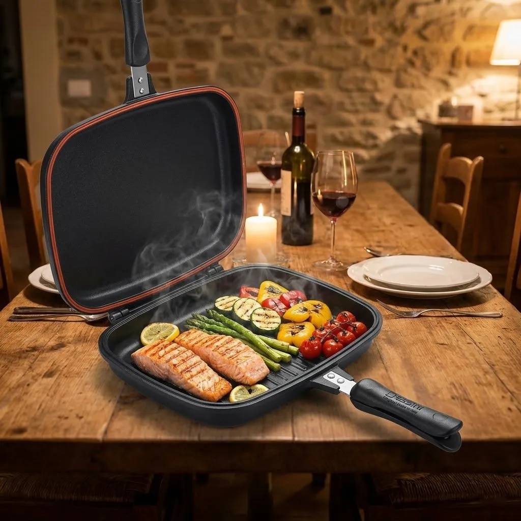 Inovația principală constă în versatilitatea celor două fețe. Una dintre tăvi dispune de striații de tip grill, ideale pentru fripturi fragede, pește sau legume, permițând scurgerea grăsimii în exces pentru un rezultat crocant. Cealaltă față este netedă, fiind perfectă pentru soteuri, omlete, clătite sau înnăbușirea legumelor. Poți folosi cele două tigăi separat sau împreună, dublându-ți capacitatea de gătire instantaneu.