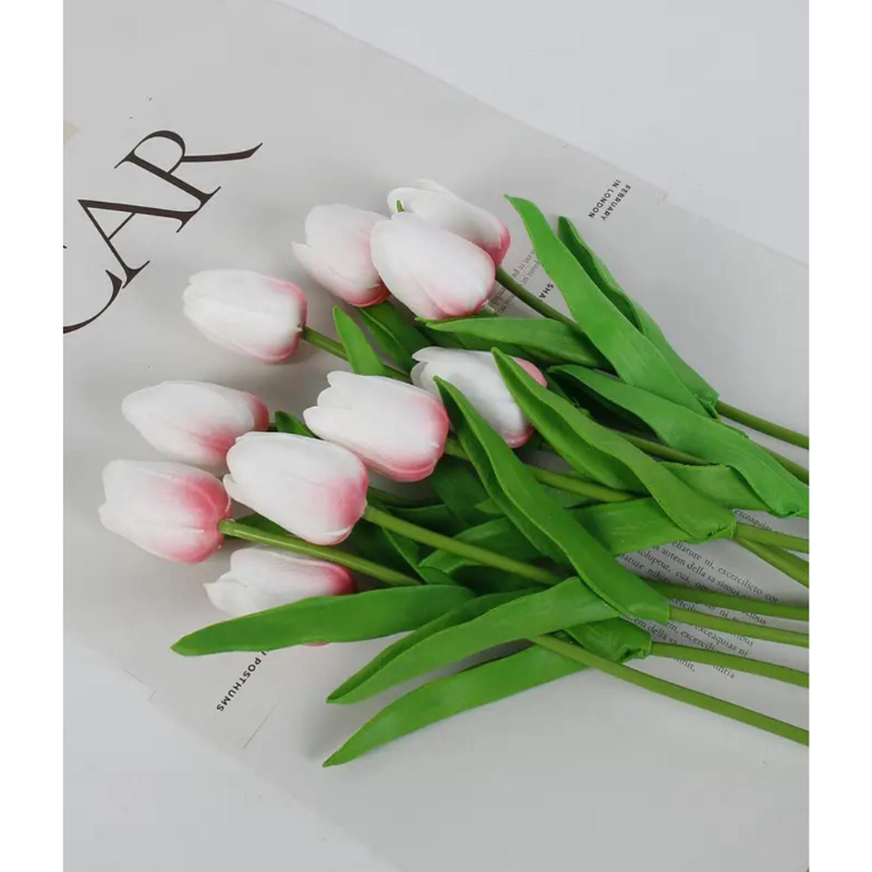Analizând detaliile vizuale, fiecare floare prezintă petale realizate din materiale premium (silicon sau poliuretan de tip „Real Touch”), care se simt fine la atingere, exact ca o floare reală. Tijele de 33 cm sunt flexibile și au o culoare verde naturală, permițându-vă să le îndoiți sau să le tăiați pentru a se potrivi perfect în orice recipient decorativ. Frunzele atașate adaugă un plus de realism, având o textură ușor cauciucată și o formă ascuțită, caracteristică lalelelor proaspăt culese.