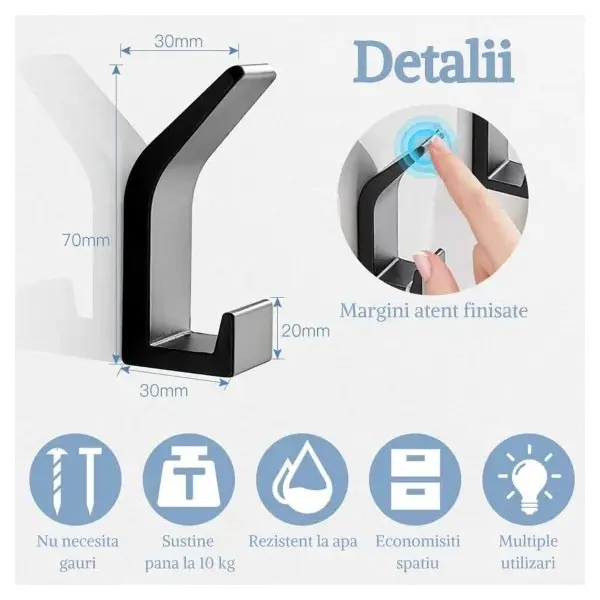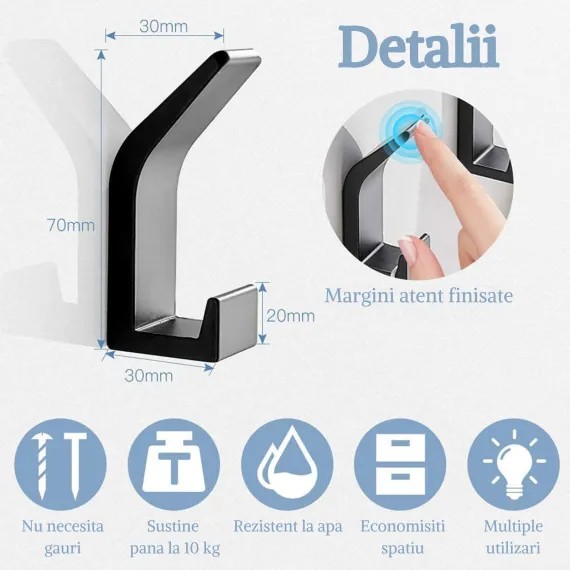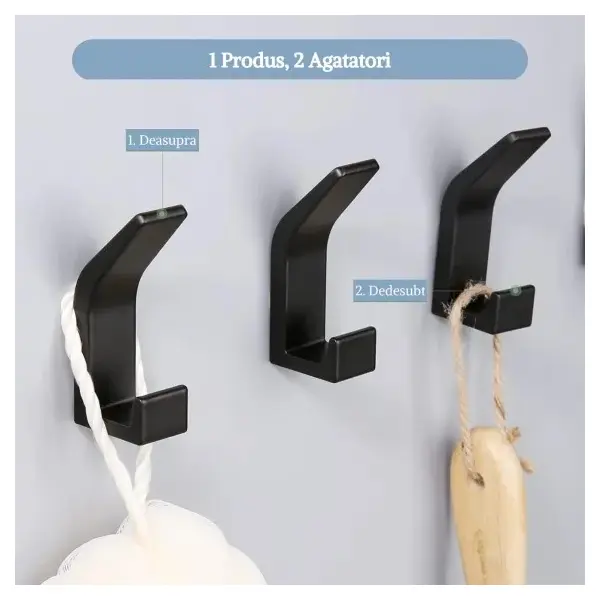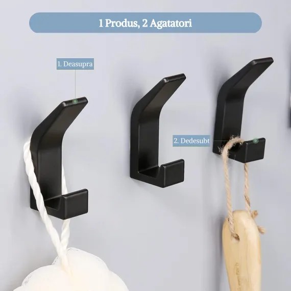 Sistemul de fixare cu dublu adeziv puternic permite instalarea imediată pe orice suprafață netedă (faianță, sticlă, metal, lemn lăcuit) fără a fi necesară utilizarea bormașinii. Acest aspect îl face ideal pentru protejarea integrității pereților și pentru o montare fără praf sau zgomot. Dimensiunile bazei de aproximativ 4.5 x 4.5 cm (sau varianta liniară, în funcție de model) asigură o distribuție uniformă a greutății, permițând suspendarea sigură a prosoapelor de baie, halatelor, ustensilelor de gătit sau a cheilor. Este un produs robust, minimalist și extrem de practic pentru orice locuință organizată.
