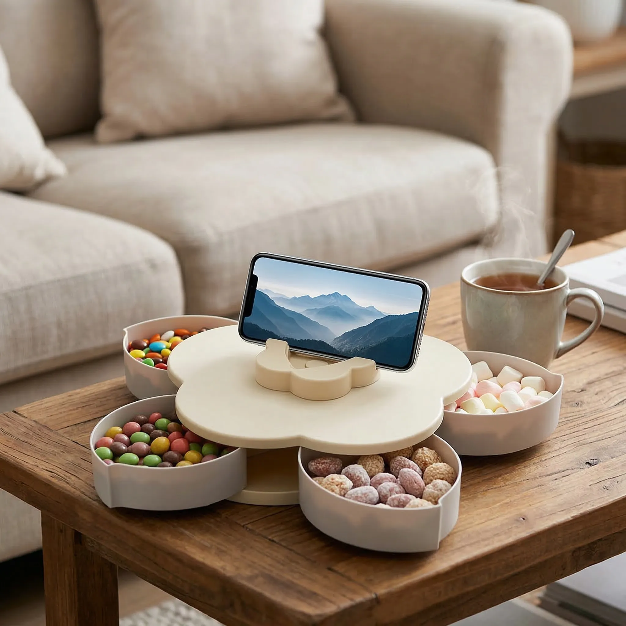 Datorită celor 5 compartimente încăpătoare care se deschid simultan printr-o simplă rotire, vei surprinde plăcut toți invitații. Suportul pentru telefon integrat în partea superioară o face ideală pentru momentele de relaxare, permițându-ți să vizionezi videoclipurile preferate în timp ce te bucuri de gustări.