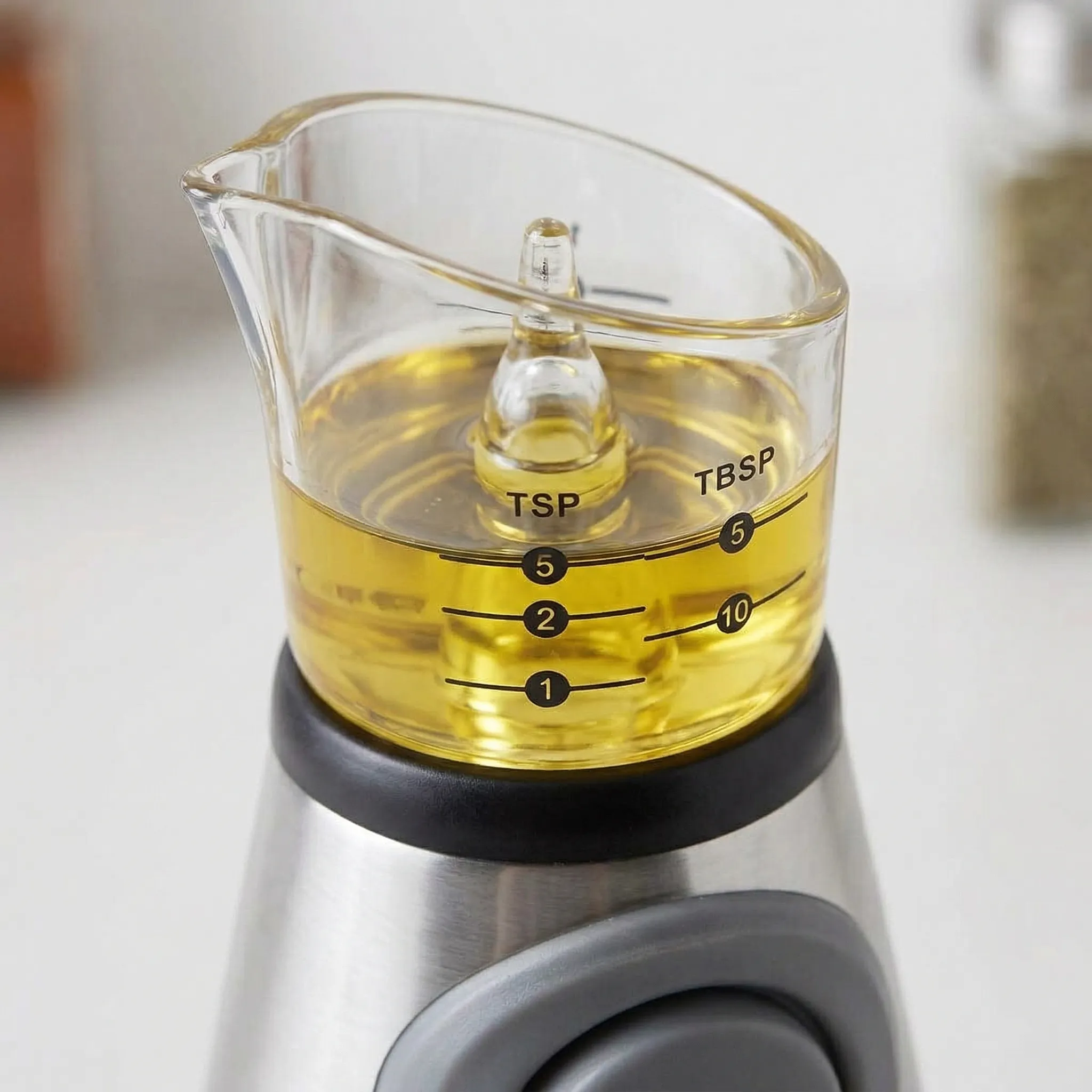 - Gradații Duble (ml și Linguri): Recipientul de măsurare de deasupra este marcat clar în mililitri (ml) și linguri (tsp/tbsp), eliminând nevoia de a murdări alte ustensile de măsură. Ideal pentru cei care urmează rețete stricte sau diete echilibrate.