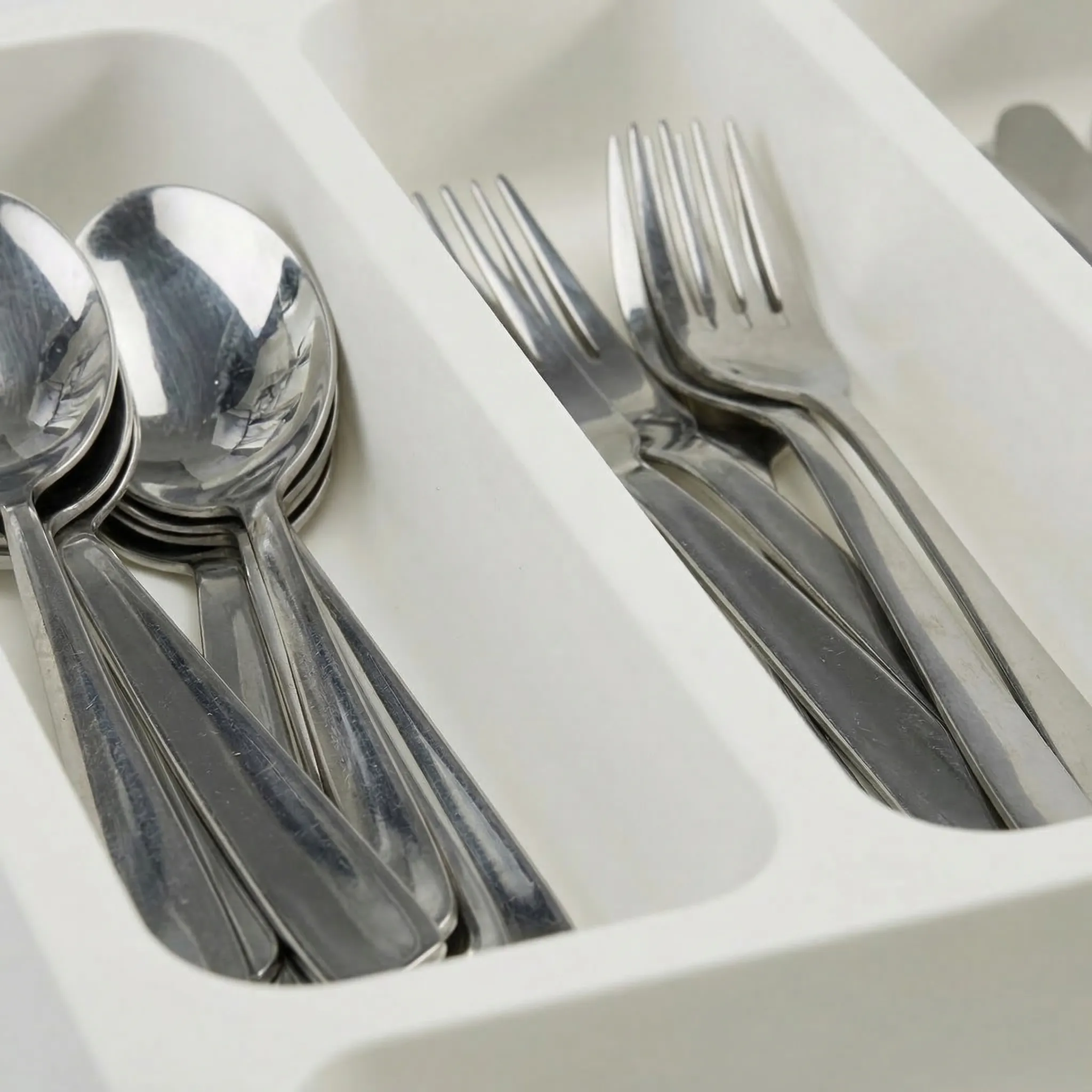 Păstrează-ți bucătăria ordonată și elegantă cu organizatorul reglabil pentru sertar de tacâmuri, o soluție practică și versatilă pentru depozitarea inteligentă a ustensilelor tale!