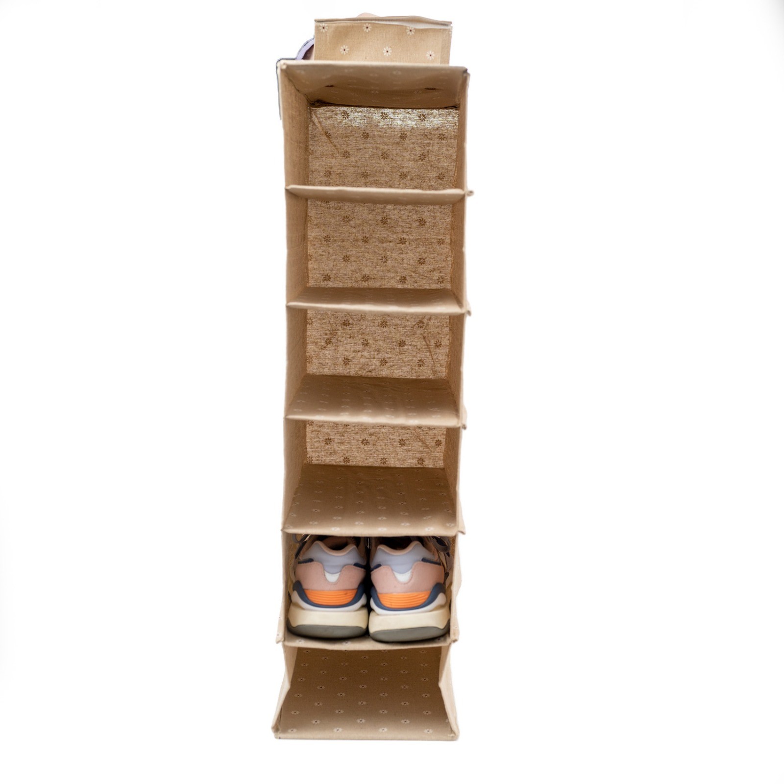 Realizat din material textil rezistent, organizatorul este ușor, flexibil și totodată suficient de robust pentru utilizare frecventă. Materialul bej, cu model discret punctat, se integrează ușor în orice tip de decor interior, fie că este vorba de un dulap clasic, un dressing modern sau spații de depozitare comerciale. Culoarea neutră îl face potrivit atât pentru uz casnic, cât și pentru revânzare în magazine de profil.