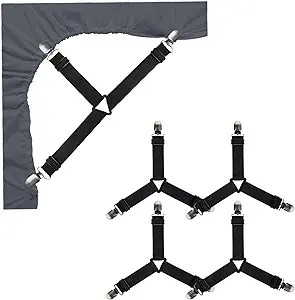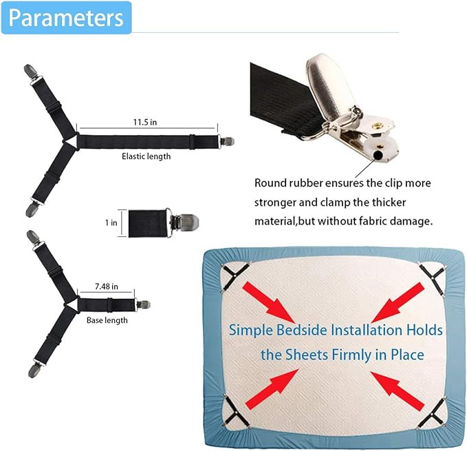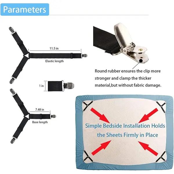 Fiecare clip este realizat din bandă elastică rezistentă, cu lungime reglabilă, și este prevăzut cu cleme metalice solide, dotate cu protecție din cauciuc. Această protecție asigură o prindere fermă pe material, fără a deteriora țesătura cearceafului, indiferent dacă este vorba despre bumbac, microfibră, satin sau alte materiale textile. Designul cu prindere în trei puncte oferă stabilitate superioară și distribuie tensiunea uniform pe colțurile cearceafului.