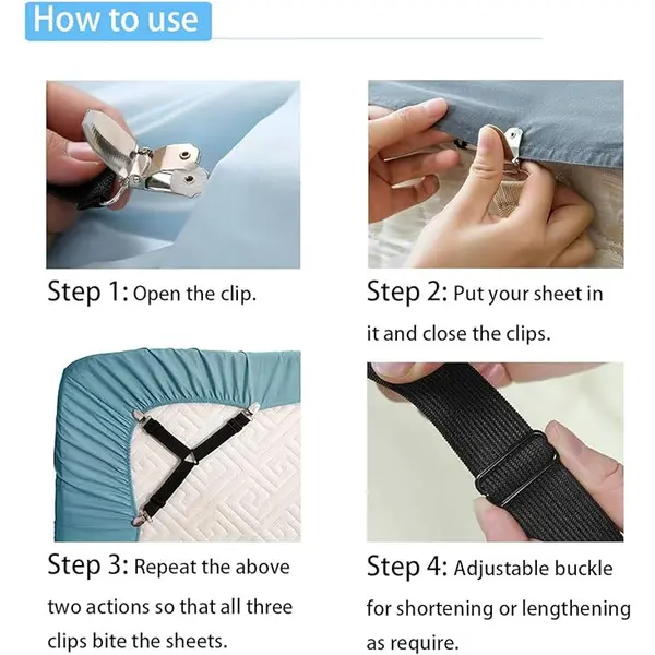 Clipurile se montează rapid, direct sub saltea, fără a fi nevoie de unelte sau modificări ale patului. Sistemul este compatibil cu majoritatea dimensiunilor de saltele, inclusiv saltele standard, saltele groase sau modele cu topper. Datorită curelelor elastice reglabile, setul se adaptează ușor la diferite formate de pat, fiind potrivit atât pentru uz casnic, cât și pentru utilizare intensivă în spații comerciale.