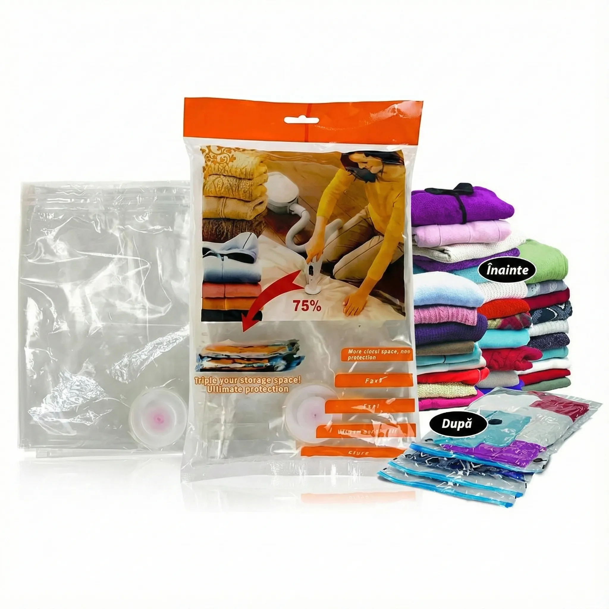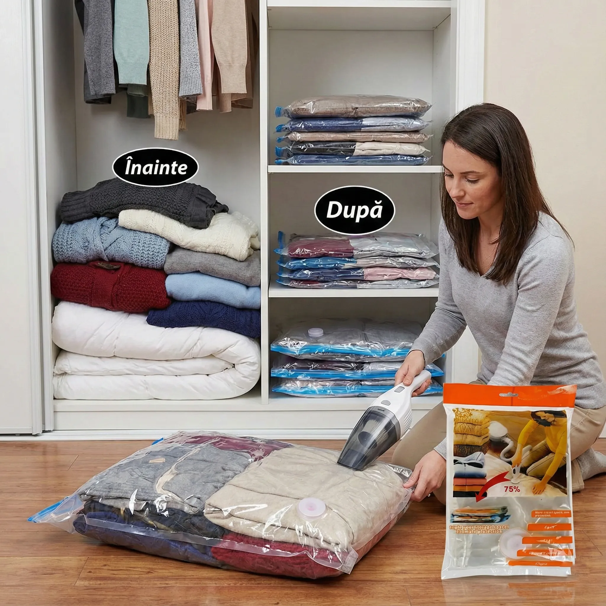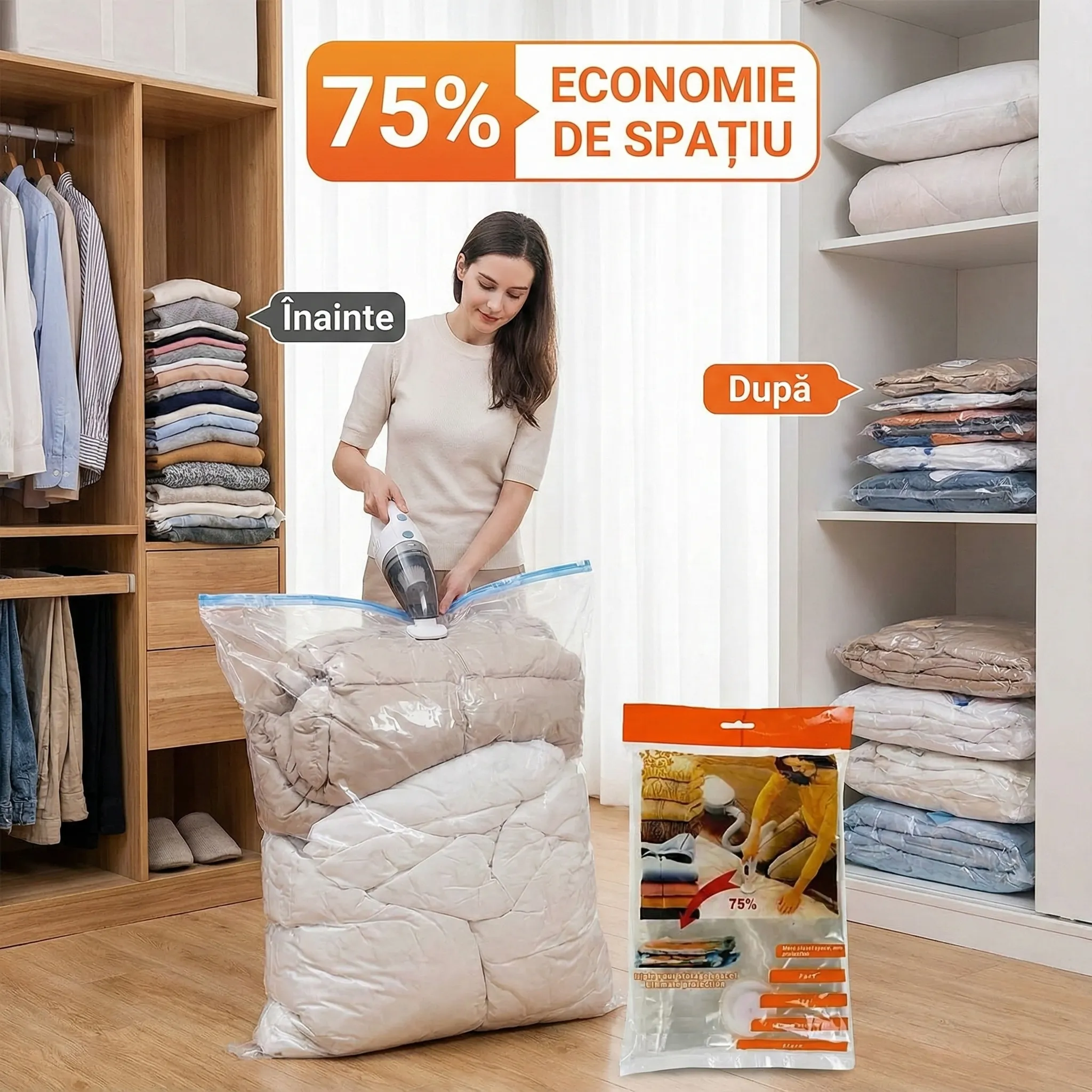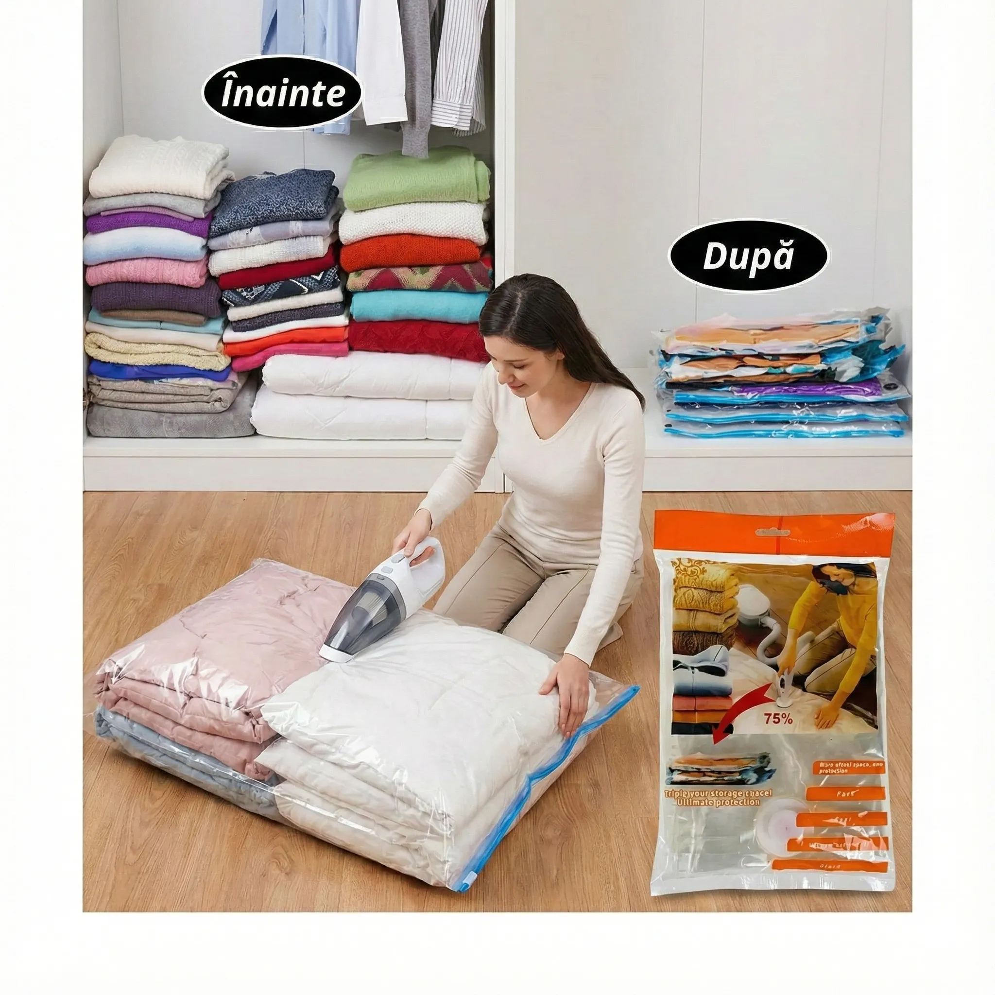 Economisire Radicală de Spațiu (Până la 80%): Datorită tehnologiei de vidare prin aspirator, volumul textilelor tale se reduce dramatic. Articolele care înainte ocupau un raft întreg acum pot fi stocate într-un colț mic, eliberând spațiu prețios pentru lucrurile pe care le folosești zilnic.
