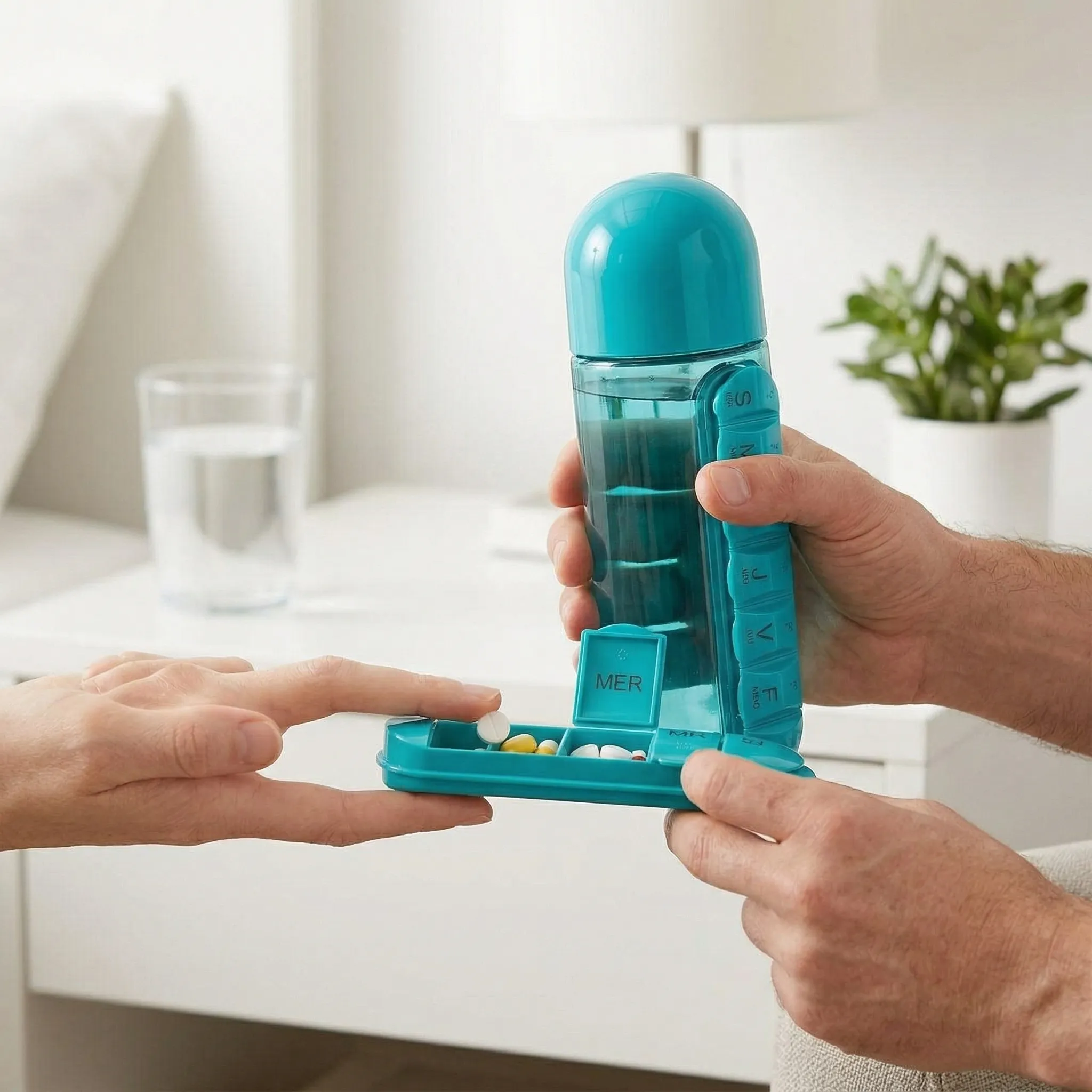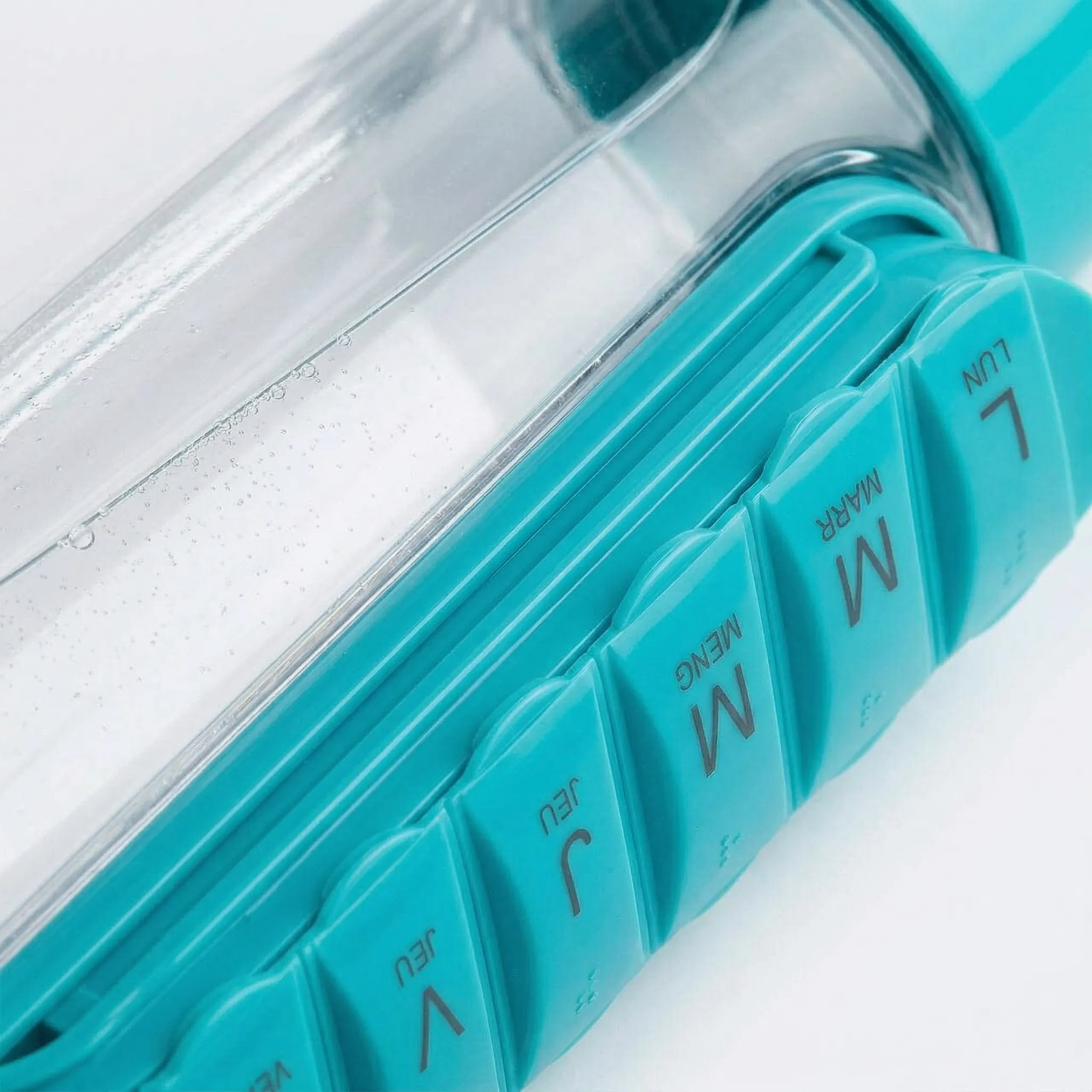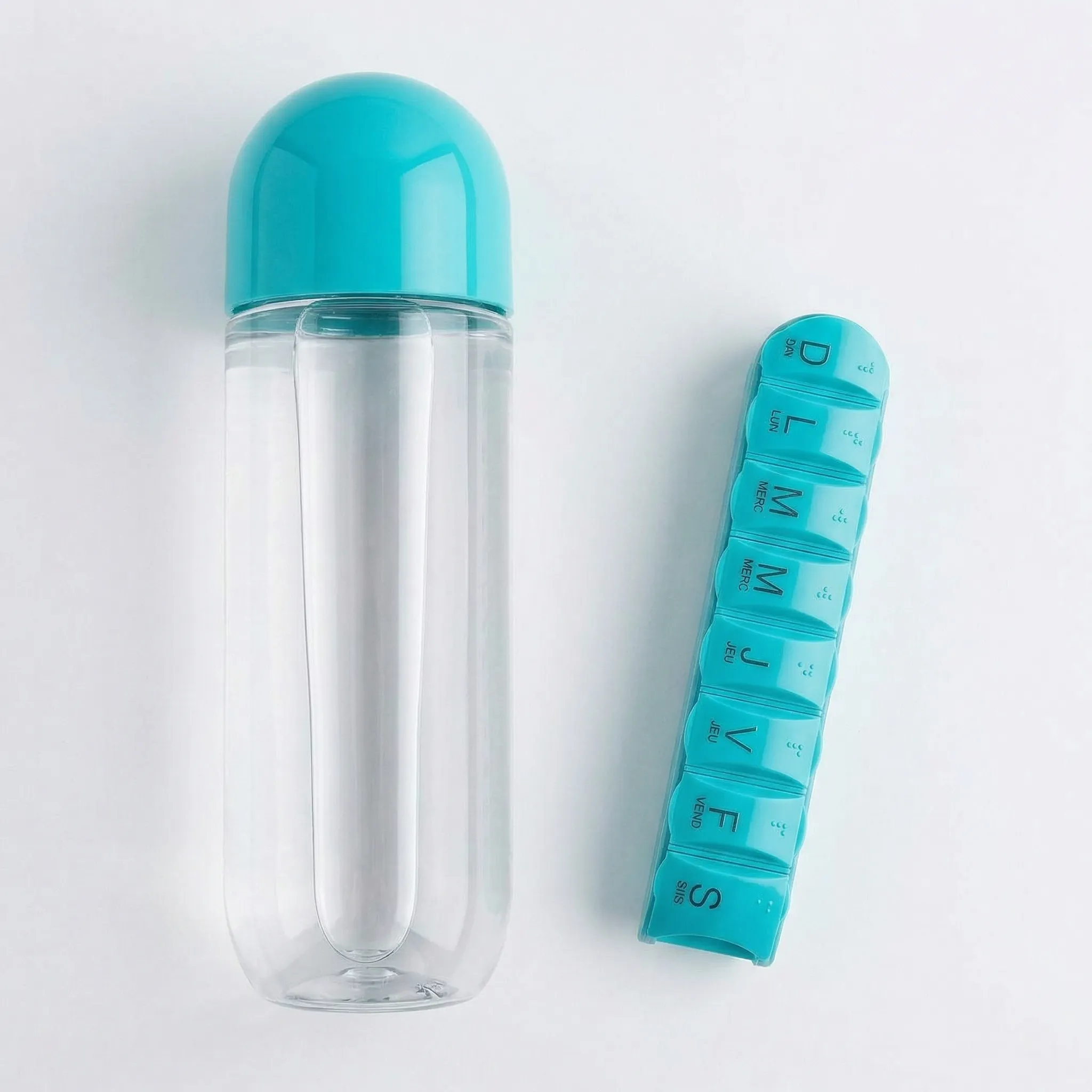 - Tip: Sticlă de apă cu organizator de medicamente detașabil.