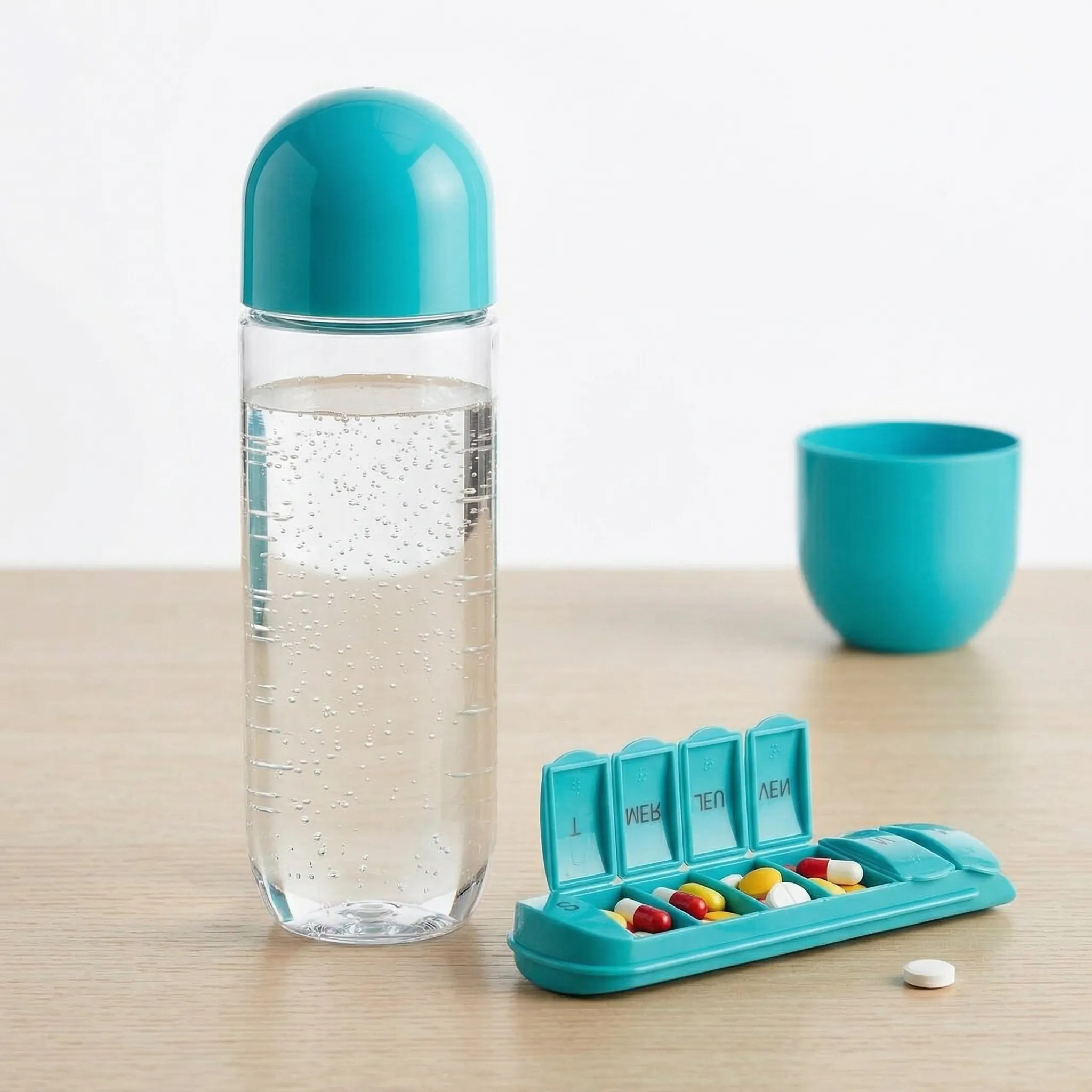 - Design Modular și Detașabil: Flexibilitatea este esențială. Organizatorul poate fi detașat cu ușurință de pe corpul sticlei, permițându-ți să folosești sticla separat pentru sport sau să iei doar pastilele cu tine dacă spațiul este limitat.
