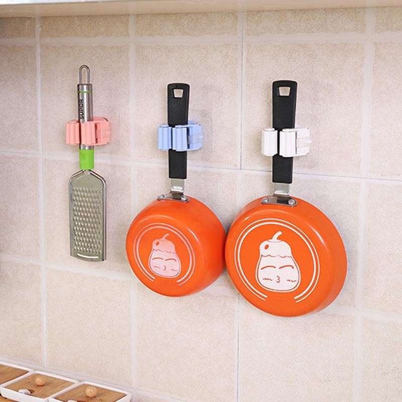 Fabricat din plastic rezistent, suportul este prevăzut cu role de prindere flexibile care se adaptează diferitelor diametre de cozi, mânere sau ustensile. Din imaginile produsului se observă clar utilizarea sa pentru mături, mopuri, perii, ustensile de bucătărie sau chiar tigăi și accesorii metalice, ceea ce îl face extrem de versatil. Sistemul de prindere menține obiectele fixe, prevenind alunecarea sau căderea acestora.