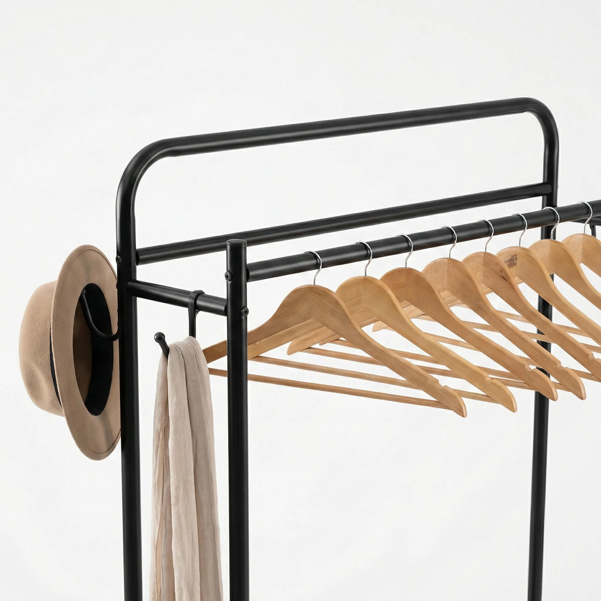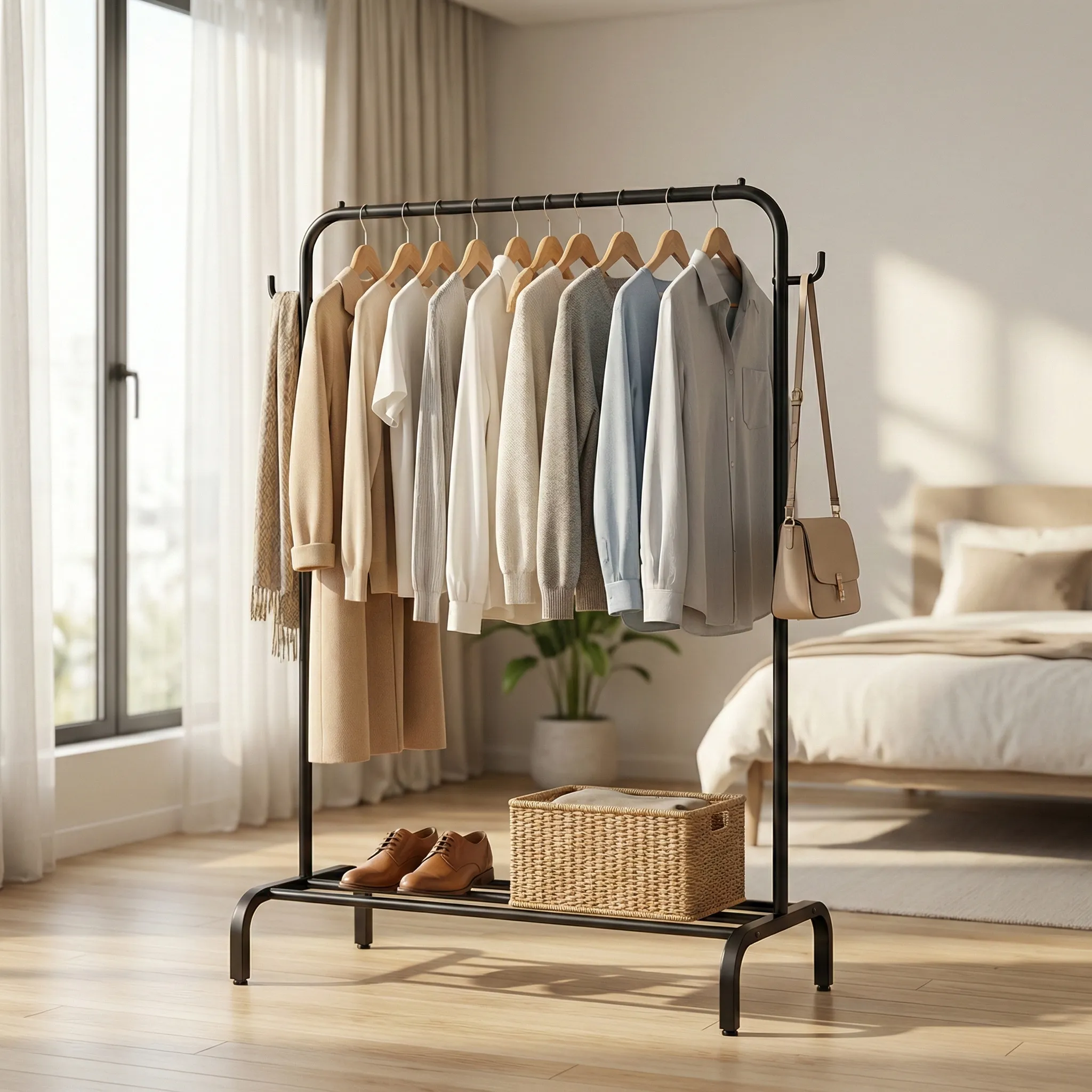 - Capacitate de Depozitare 3-în-1: Nu este doar un suport pentru umerașe. Partea inferioară este prevăzută cu un raft special pentru pantofi sau cutii de depozitare, iar cuierele laterale sunt ideale pentru genți, pălării, eșarfe sau curele.