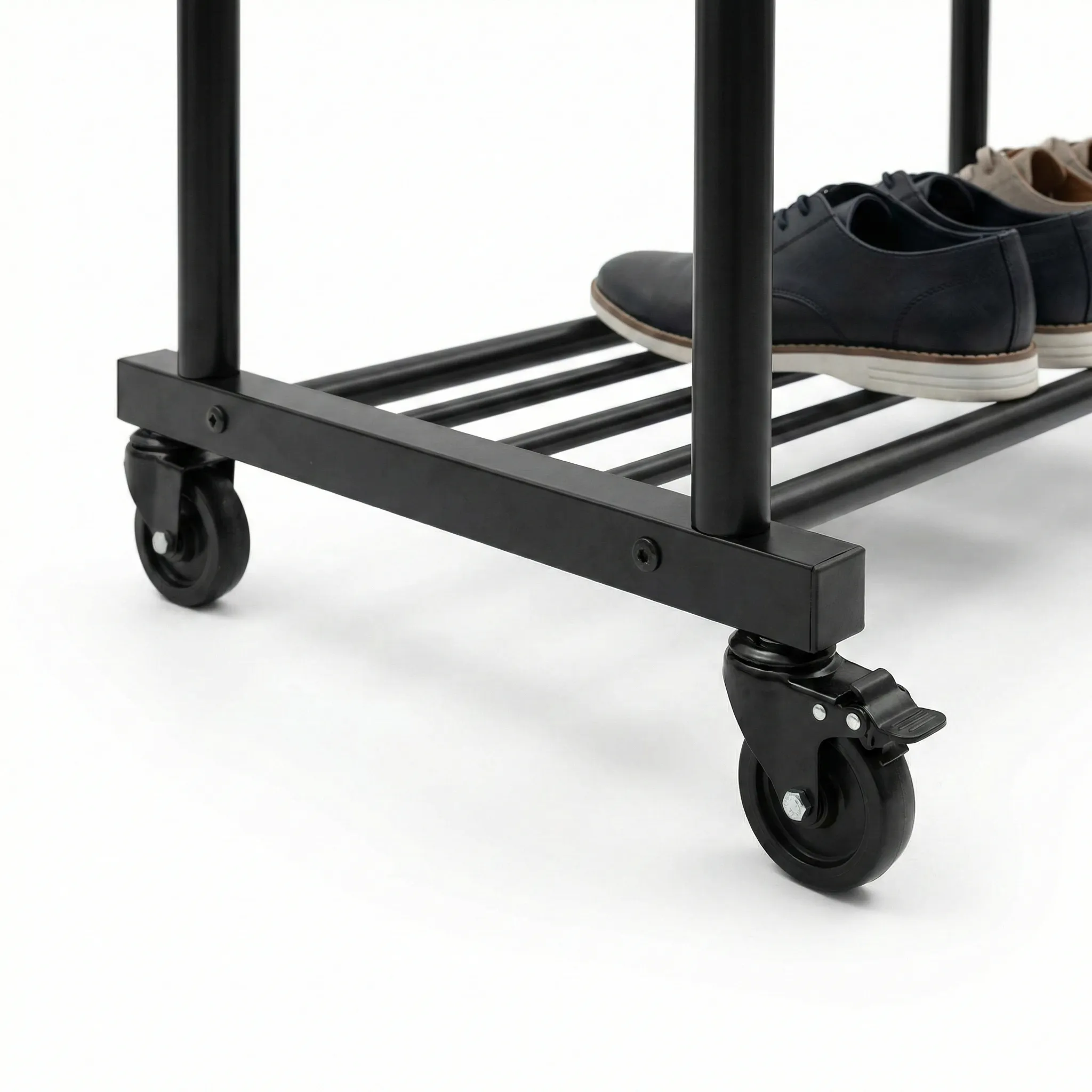 - Mobilitate și Stabilitate: Dotat cu roți rezistente, suportul poate fi mutat cu ușurință dintr-o cameră în alta, chiar și atunci când este încărcat. Sistemul de frânare integrat îți permite să îl fixezi ferm în locul dorit, oferind siguranță maximă.