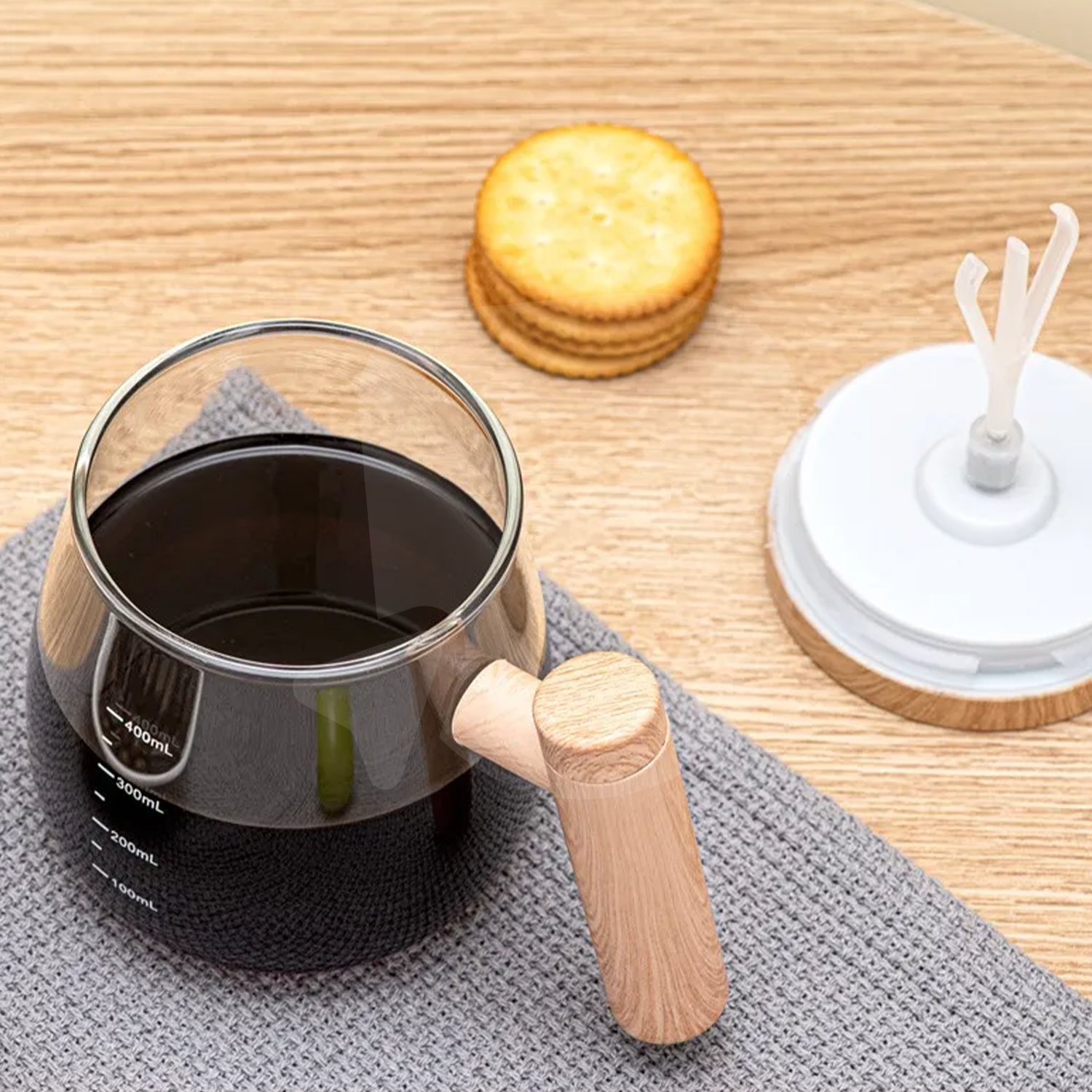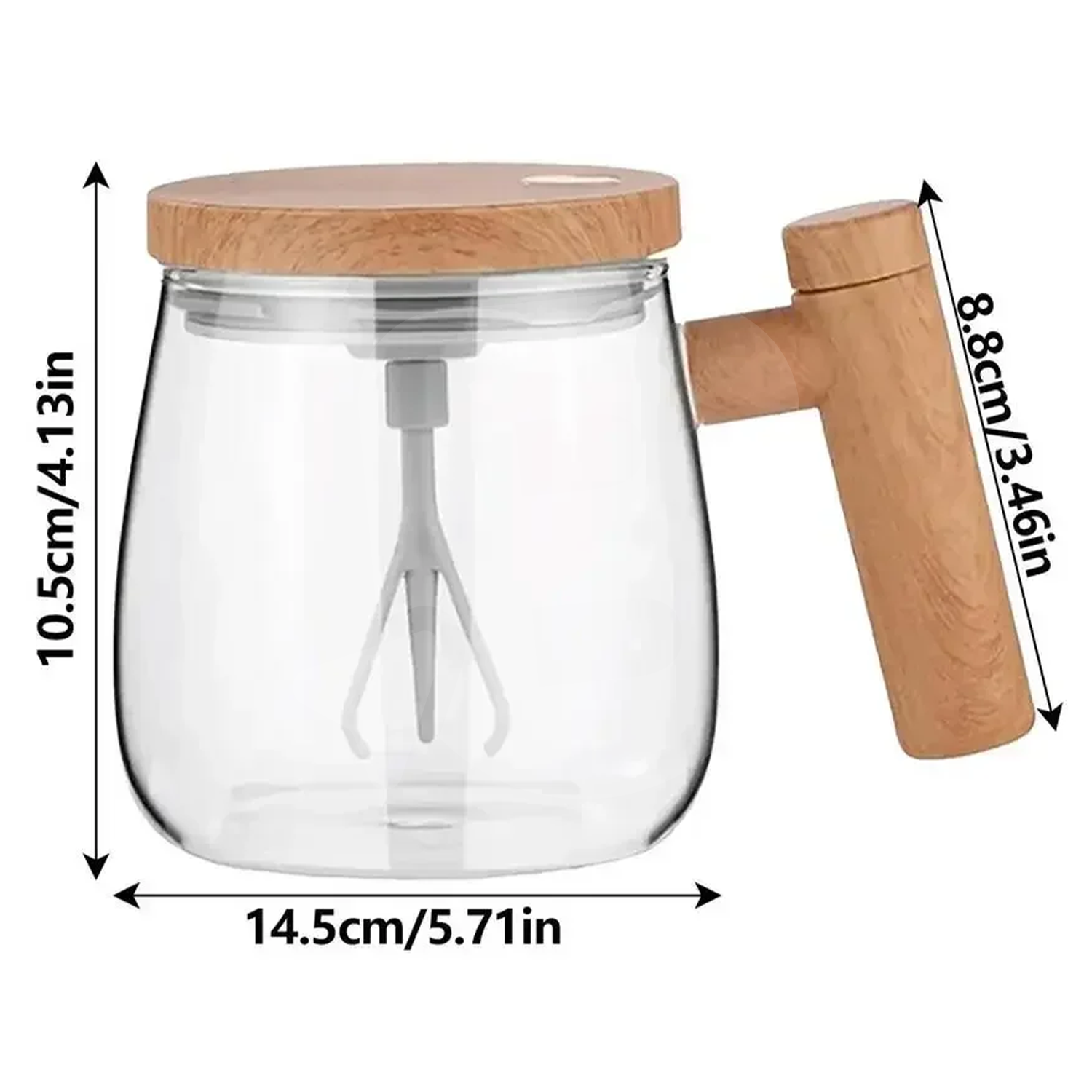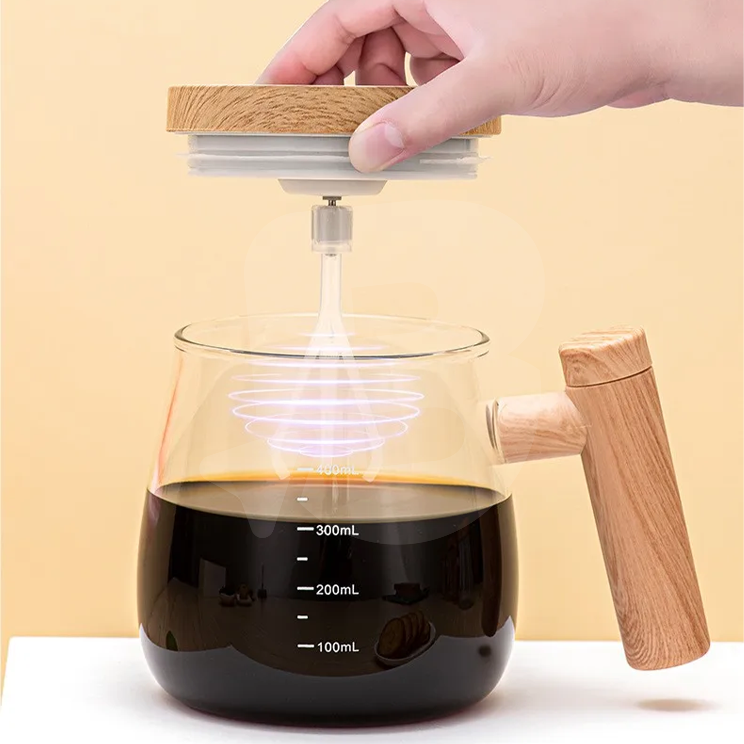 Recipientul este realizat din sticlă transparentă rezistentă, cu marcaje de volum clare între 100 ml și 400 ml, permițând dozarea precisă a lichidelor. Capacul cu motor integrat acționează un agitator cu trei brațe, vizibil în interior, care asigură amestecarea eficientă fără depuneri sau cocoloașe. Din imaginile produsului reiese o viteză de rotație ridicată (până la 7000 rpm), ideală pentru băuturi groase sau pulberi greu solubile.