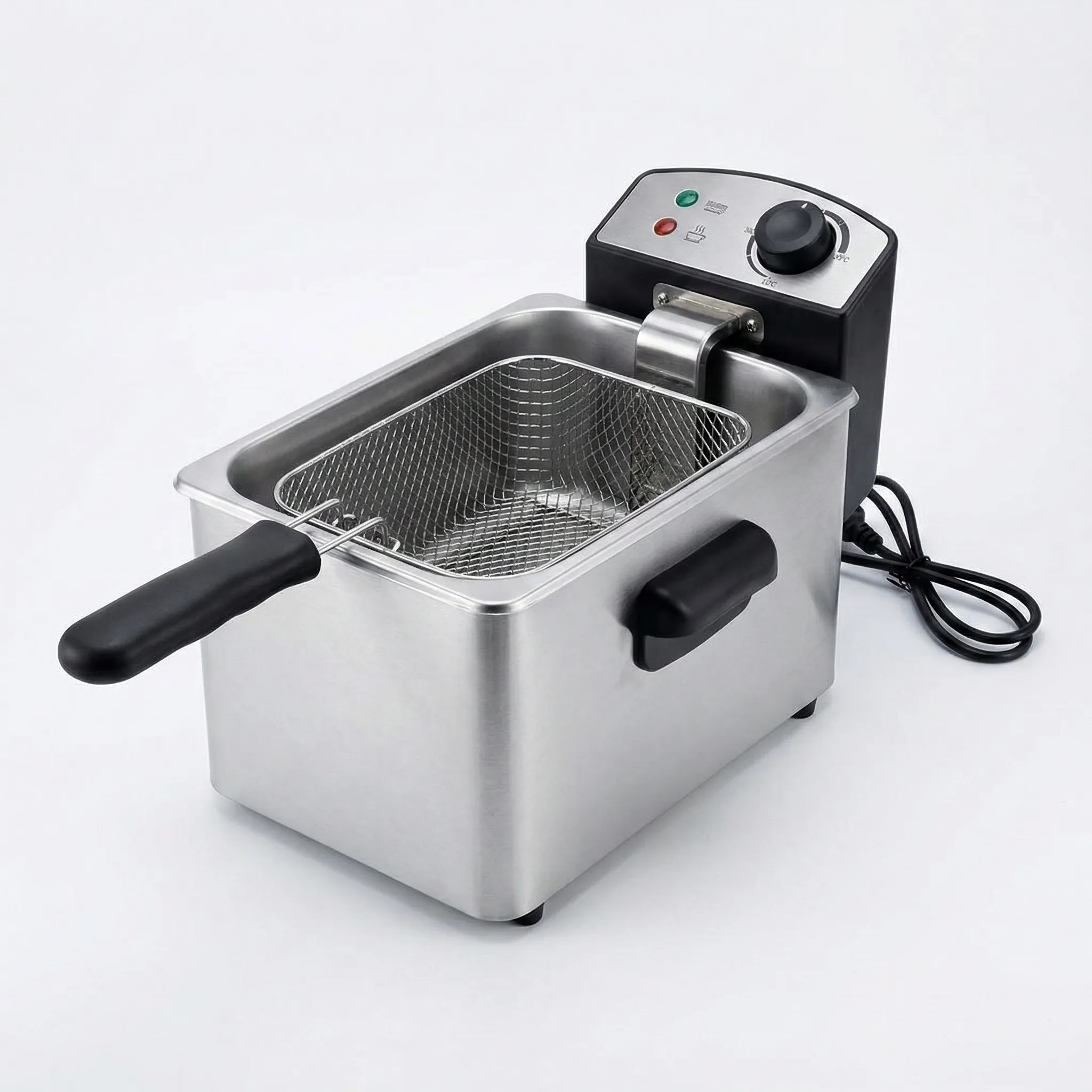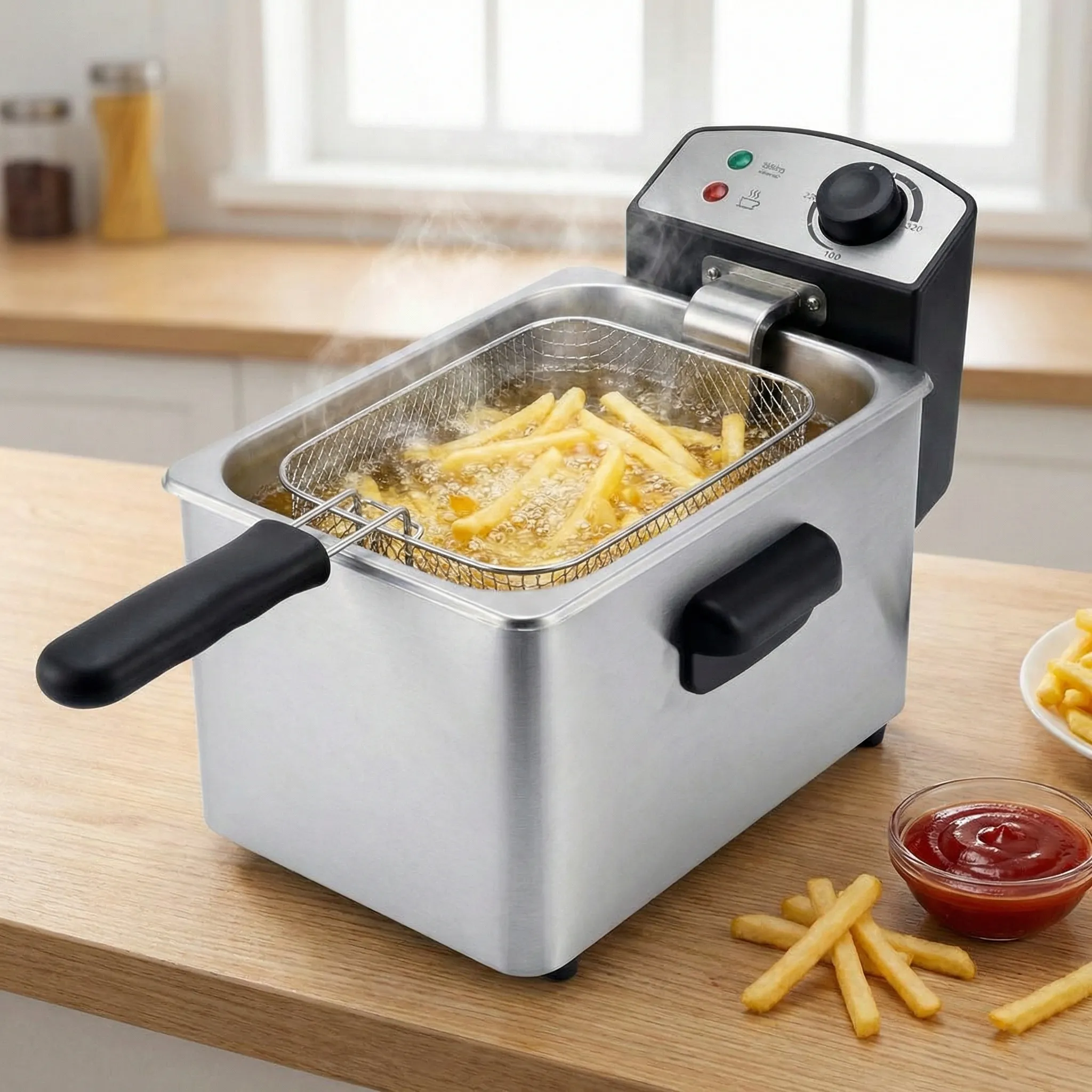 Design Sigur, Durabil și Ușor de Întreținut: Construită din oțel inoxidabil de înaltă calitate, friteuza este rezistentă și se integrează elegant în orice decor. Funcțiile de protecție la supraîncălzire și picioarele anti-alunecare asigură o utilizare fără riscuri. În plus, coșul detașabil și sistemul de scurgere a uleiului facilitează o curățare rapidă după fiecare folosire.