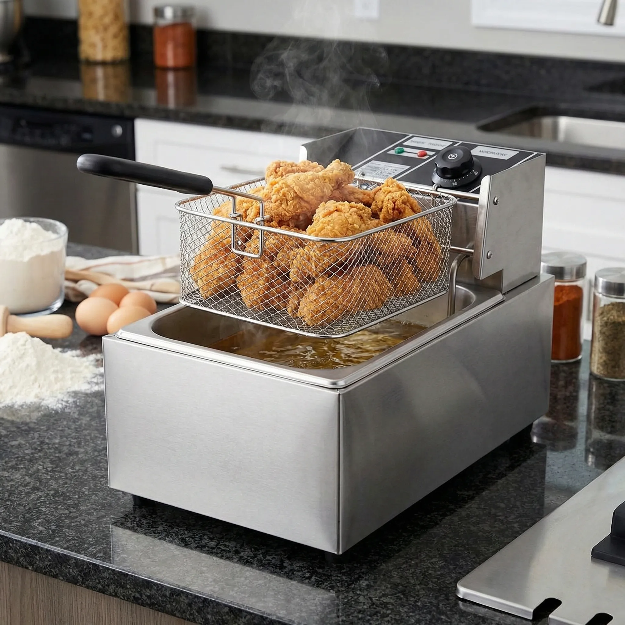 Transformă gătitul acasă într-o experiență rapidă, sigură și delicioasă! Bucură-te de gustul inconfundabil al preparatelor crocante direct la tine acasă! Friteuza electrică RAF de 5.5L combină performanța de nivel profesional cu ușurința utilizării casnice, oferind rezultate perfecte de fiecare dată. Fie că pregătești o cină rapidă pentru familie, organizezi o masă festivă cu prietenii sau gestionezi o mică unitate de catering, acest aparat îți garantează preparate aurii și savuroase.